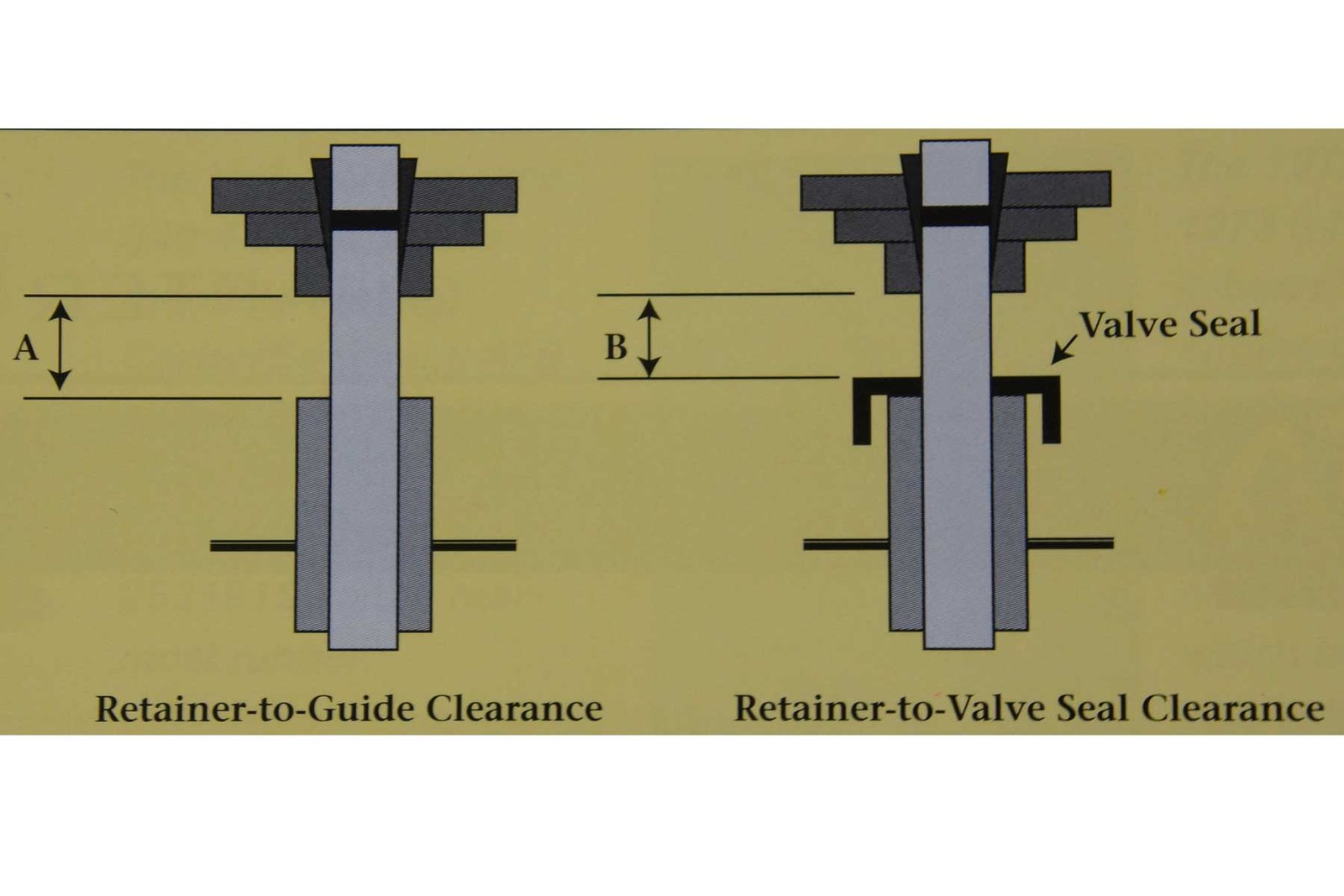 Once the rocker arms are installed and the lash is adjusted, there must be an allowance of approximately 0.050-inches between the valve spring retainer and the valve seal at maximum valve lift. The valve spring retainer to valve seal clearance is measured with the valve in the head at the installed height and assembled without the valve spring.