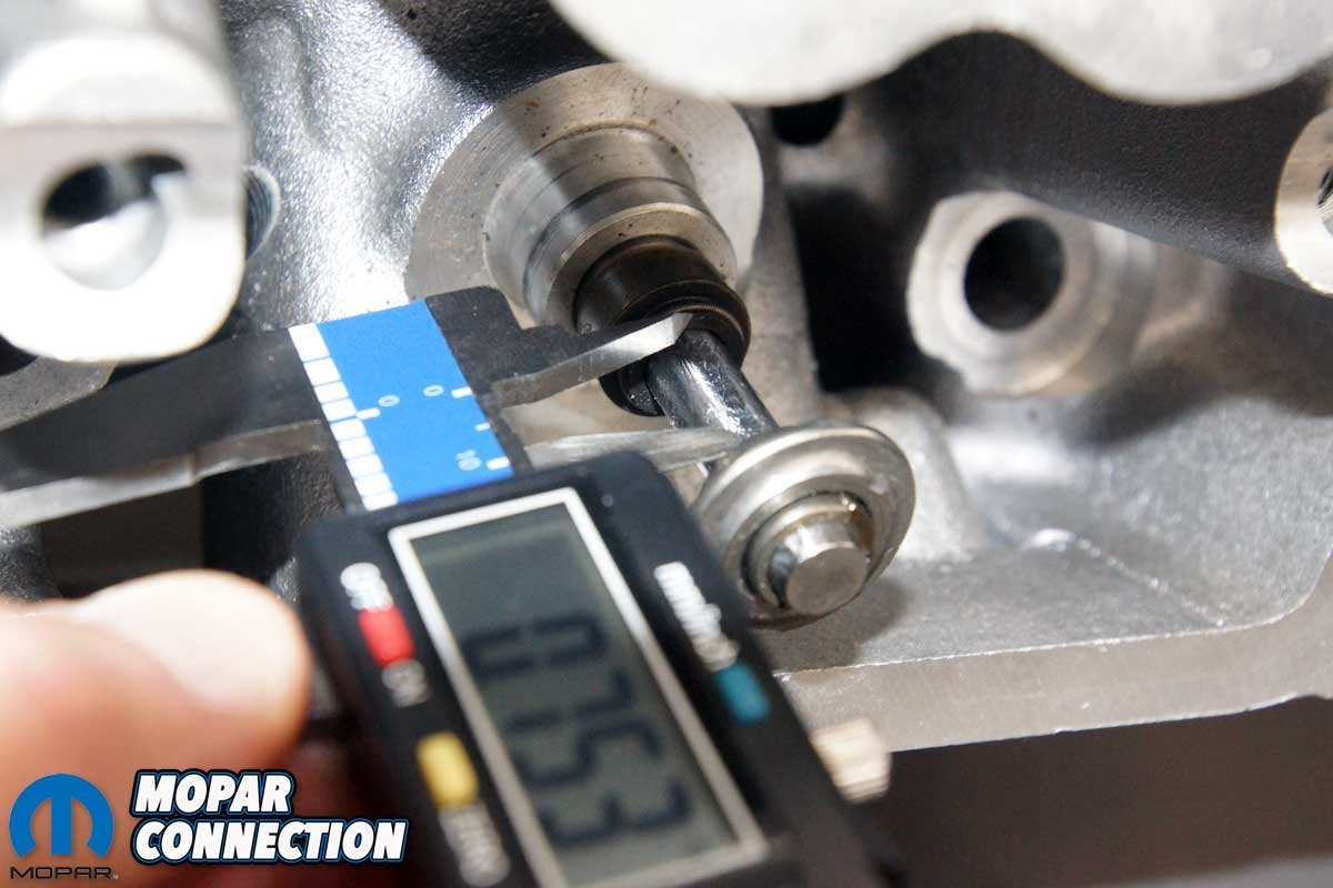 With the seal located over the valve guide, the distance between the valve spring retainer to valve seal is measured with vernier calipers. Then, the valve lift (with the new rocker ratio) is subtracted from the installed height to attain the seal-to-retainer clearance.
