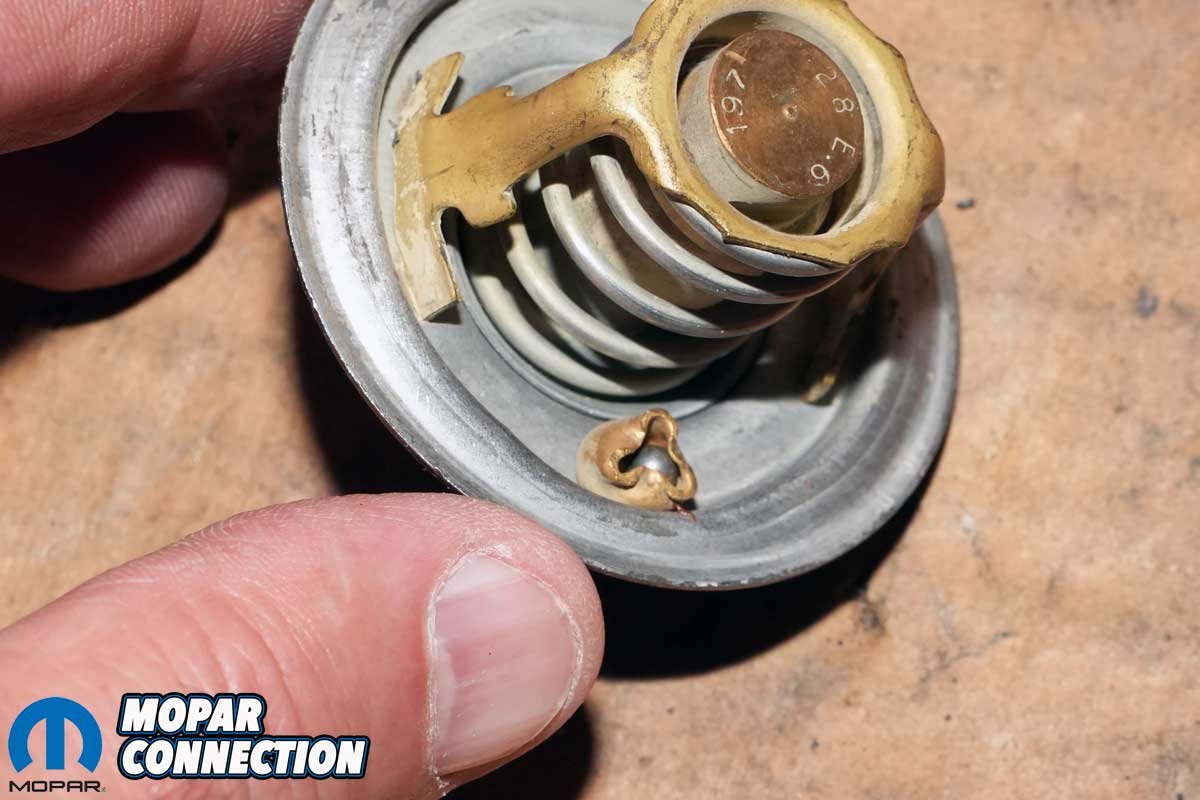 Above Left: Thermostats allow the engine to warm up quickly when closed and maintain the coolant temperature once opened. A thermostat prevents overcooling but not overheating. Above Right: Many, but not all, thermostats have a jiggle pin (check ball in a crimped housing) that allows trapped air to bleed through to the radiator when the thermostat is closed.