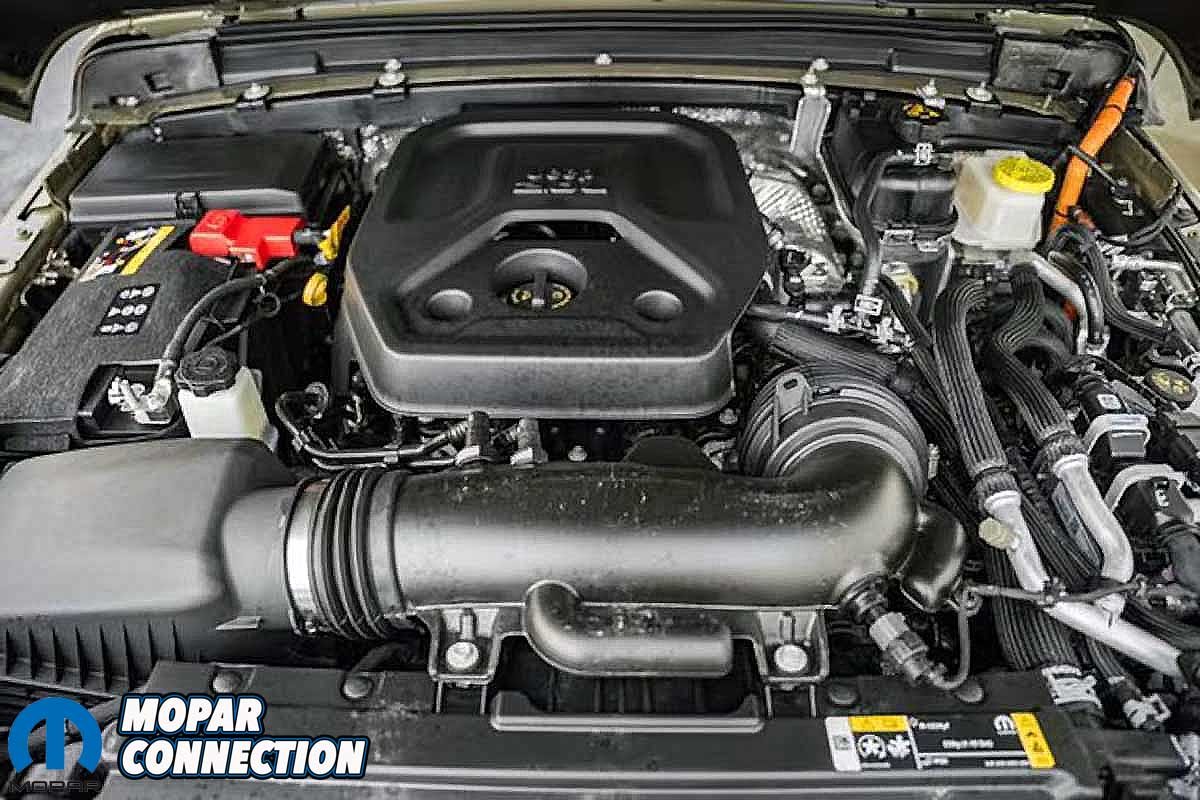 Above: After several decades of minimal changes to the cooling system layout, the last thirty years have seen significant advancements in thermal management systems. The Hemi (left) had a mechanical water pump, two radiator hoses, and a pair of heater hoses. The Wrangler 4xe (right) has a crowded engine bay with a cooling system that includes radiator hoses, a degassing tank, multiple heater core hoses, coolant valves, and mechanical and electric water pumps.