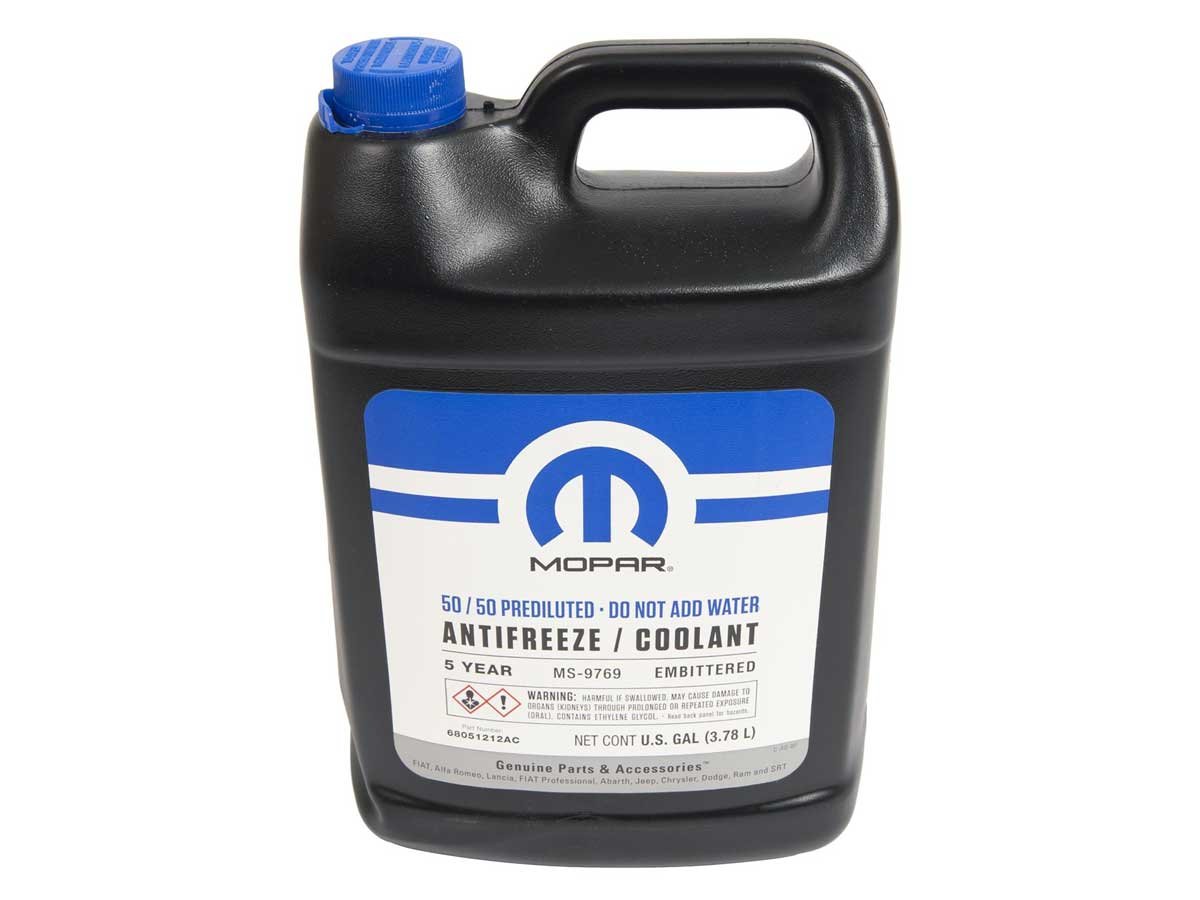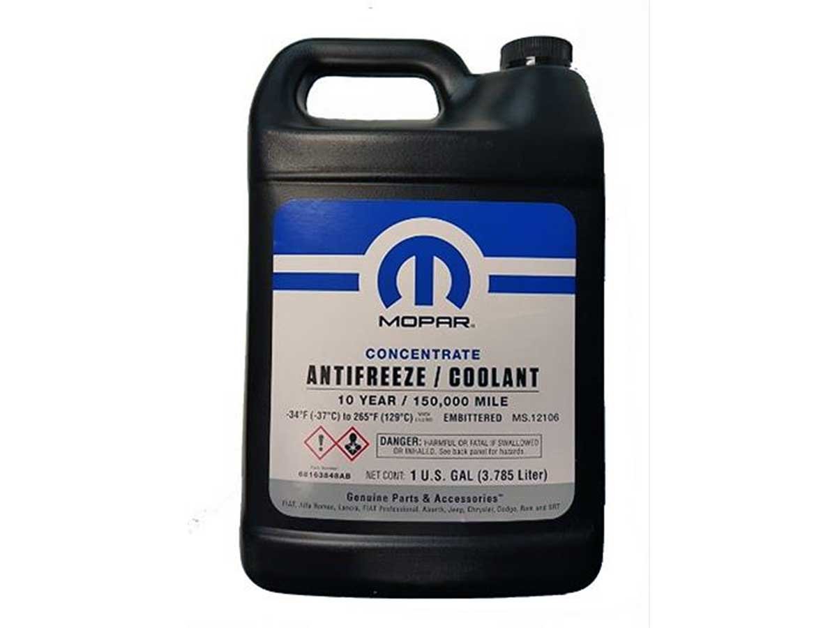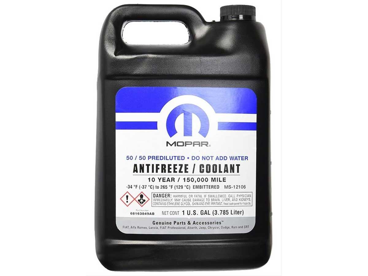 From 2013 to date, Organic Acid Technology (OAT) has been used in most Chryslers, Dodges, Jeeps, Ram Trucks, and Fiats since the FCA merger. The coolant is pink or purple; the Mopar OEM 50/50 mix part number is 68163849AB, and the OEM concentrate part number is 68163848AB.