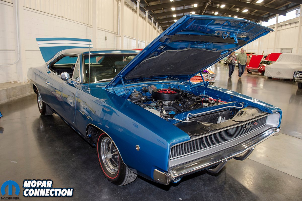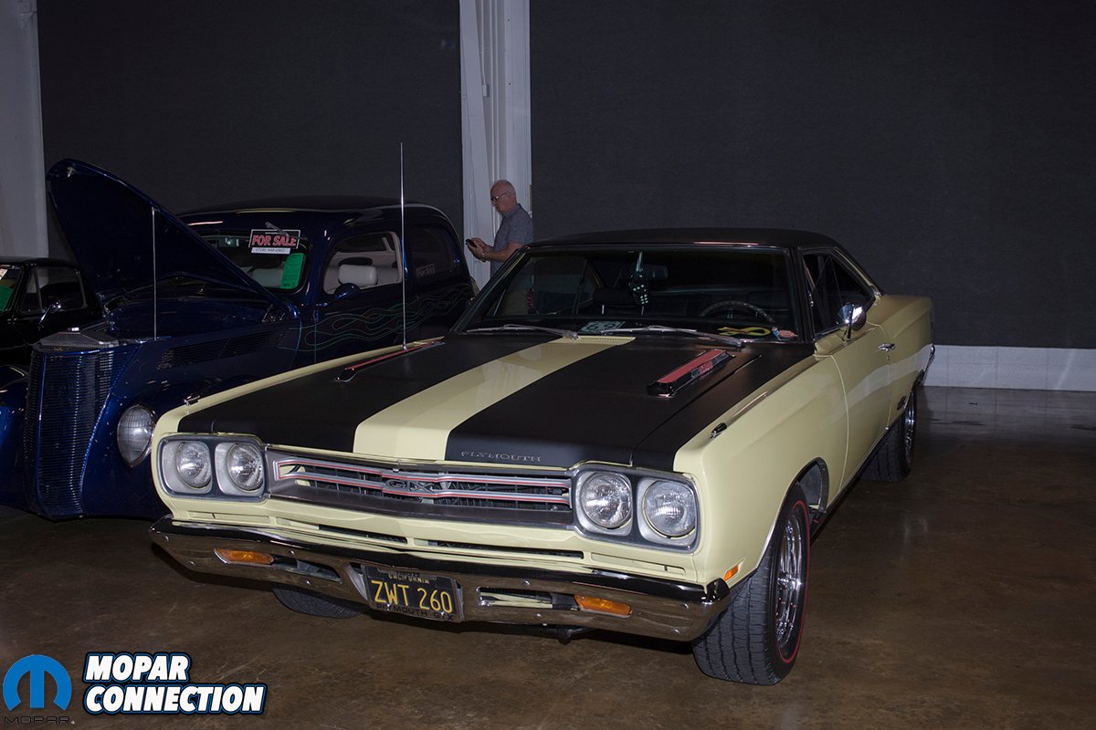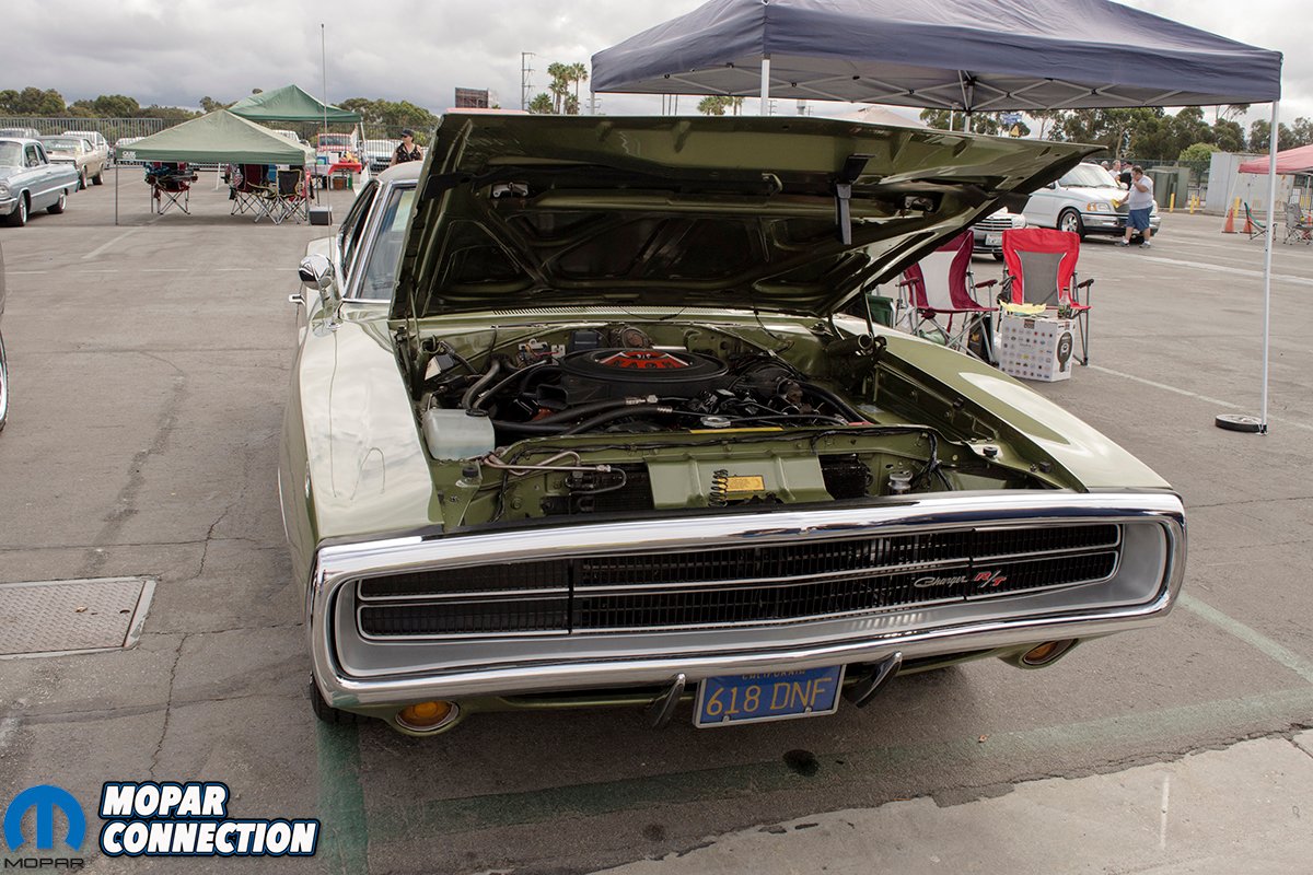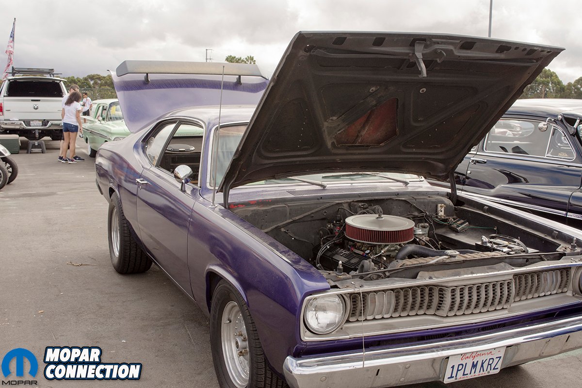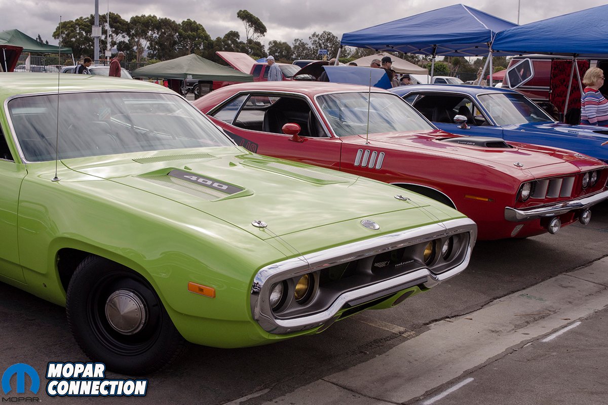 At the very back of the venue, we were able to find a black 2013 Dodge Challenger parked next to a 1970 Dodge Charger painted in Light Green Metallic. This perfect photo opportunity represented how Mopar history changed through the decades. Next up, we found a trio of 1970s Mopars, which included a Sublime Green 1971 Plymouth Roadrunner, a Rallye Red 1971 Plymouth 440-6 ‘Cuda, and a 1972 Plymouth Barracuda finished in Basin Street Blue. We were also able to point out Larry Dewees’ work-in-progress 1973 Plymouth Duster, which was sitting just a few cars away.