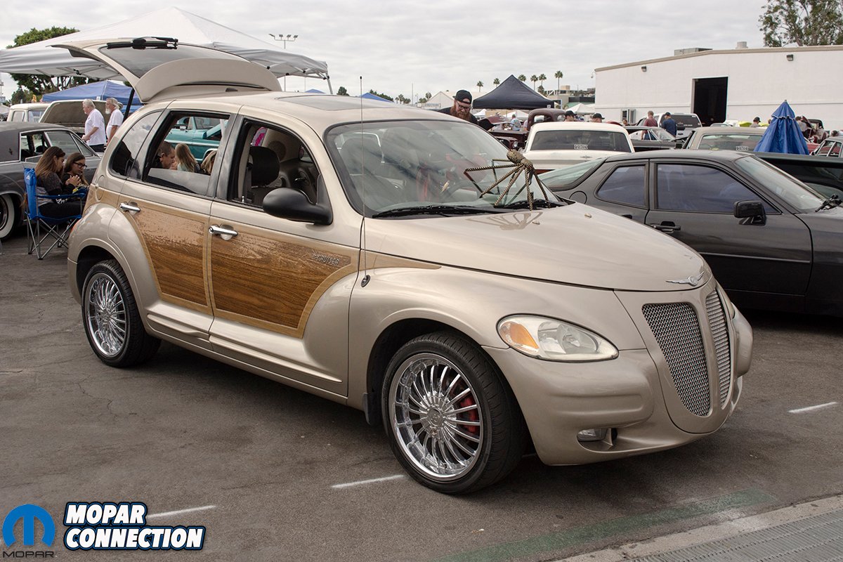 Across the way, was yet another black ’63 Polara. This car had the iconic Cragar 5-spoke wheels, black interior, and red flames. Just a couple cars down from this Polara, was the iconic Chrysler PT Cruiser from the early 2000s. This particular PT Cruiser was customized with wood paneling, and aftermarket wheels.