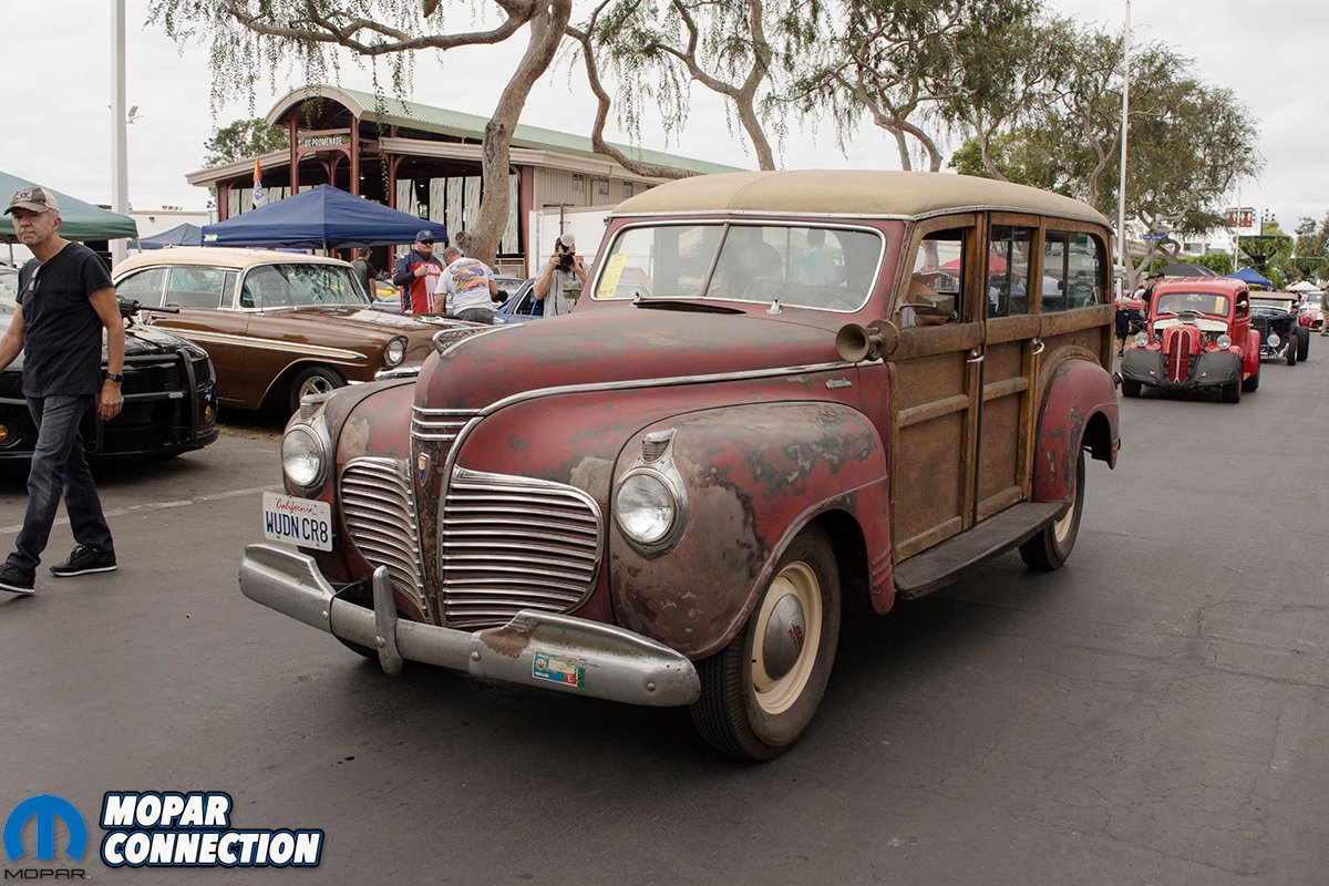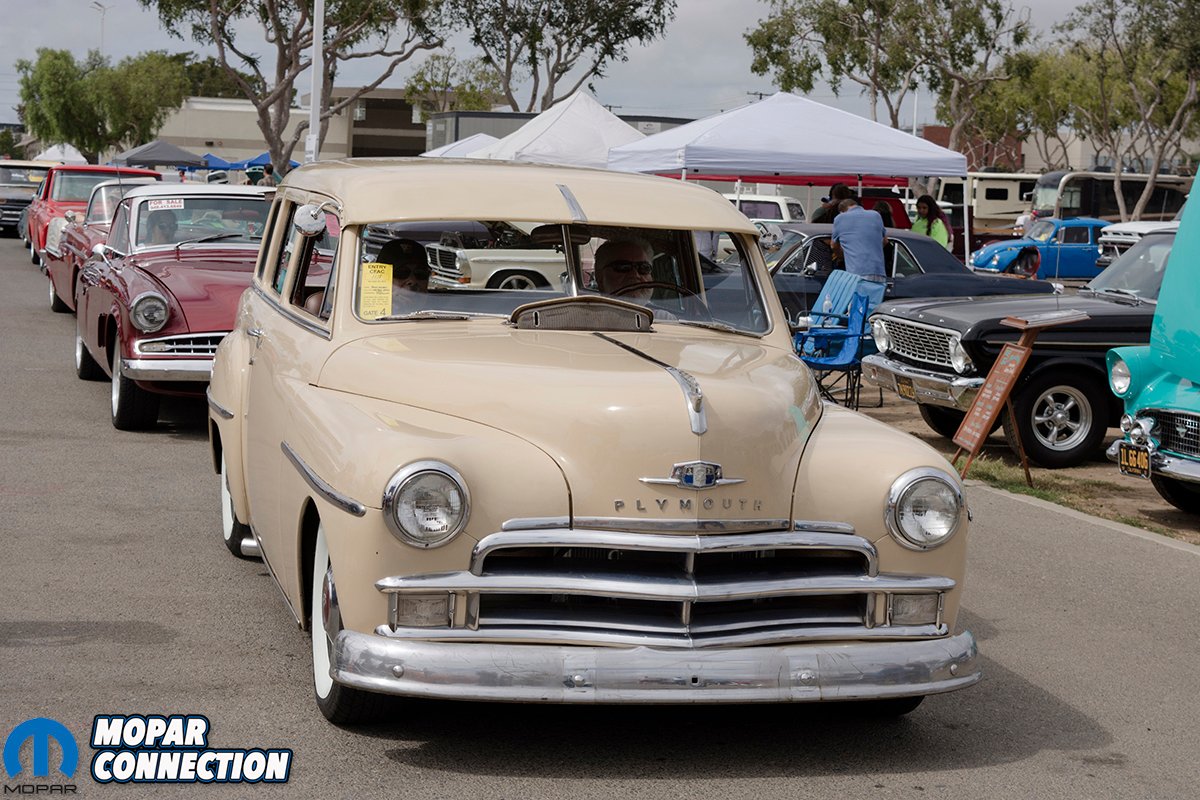 Towards the end of the show, we were able to find a beautiful 1964 Plymouth Savoy Max Wedge sitting along the fence. This sweet ride was finished in white with a charcoal gray interior, and sported the 426 cubic-inch Max Wedge engine. Cruising around the show was Ron Allen driving his absolutely pristine 1950 Plymouth station wagon finished in Plymouth Cream.