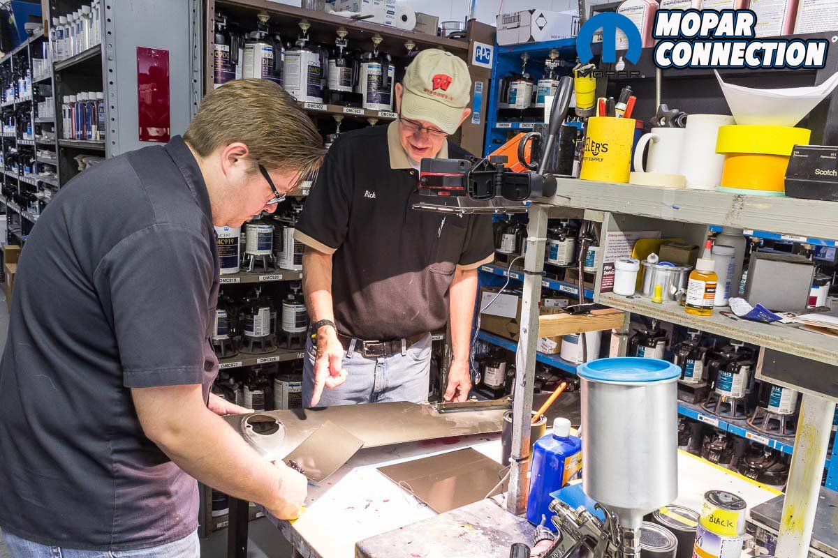 Above left: After the 3rd coat has been applied, a sunlight is used with the booth lights off to check for consistent coverage and uniform metallic (if used) application. If there were to be any irregularities, another coat could still be applied to get it just right. Above right: It’s common for MCR to work with their PPG paint distributor under controlled lighting to verify that they have the precise color desired. Test spray-outs are regularly done to see the actual color on a test panel.