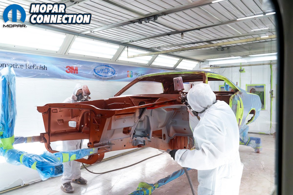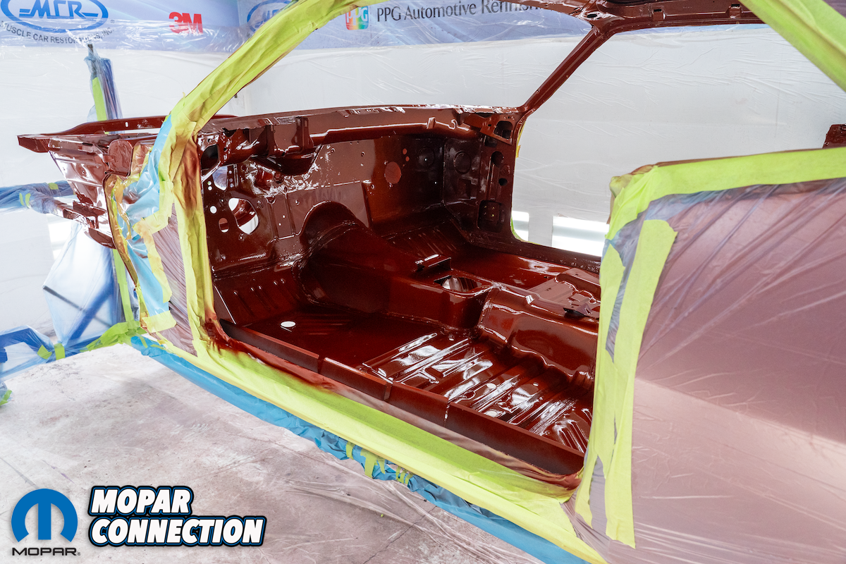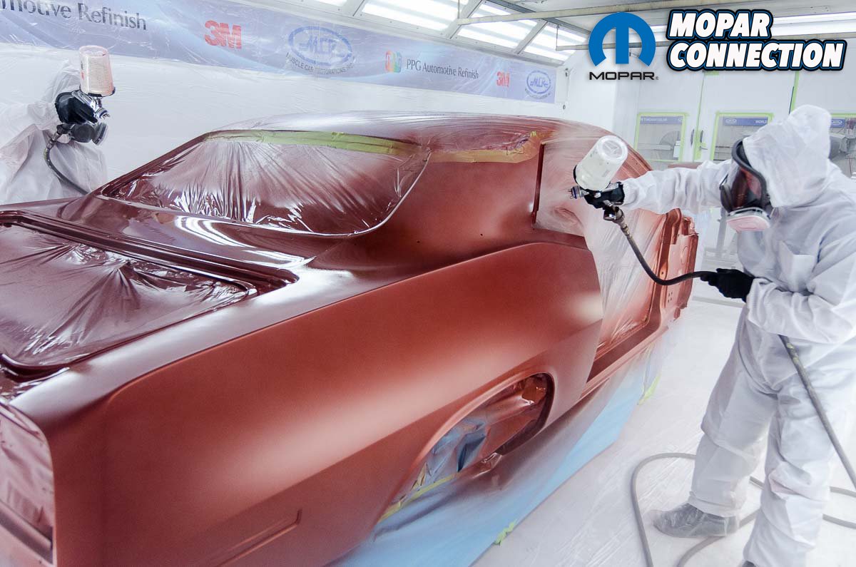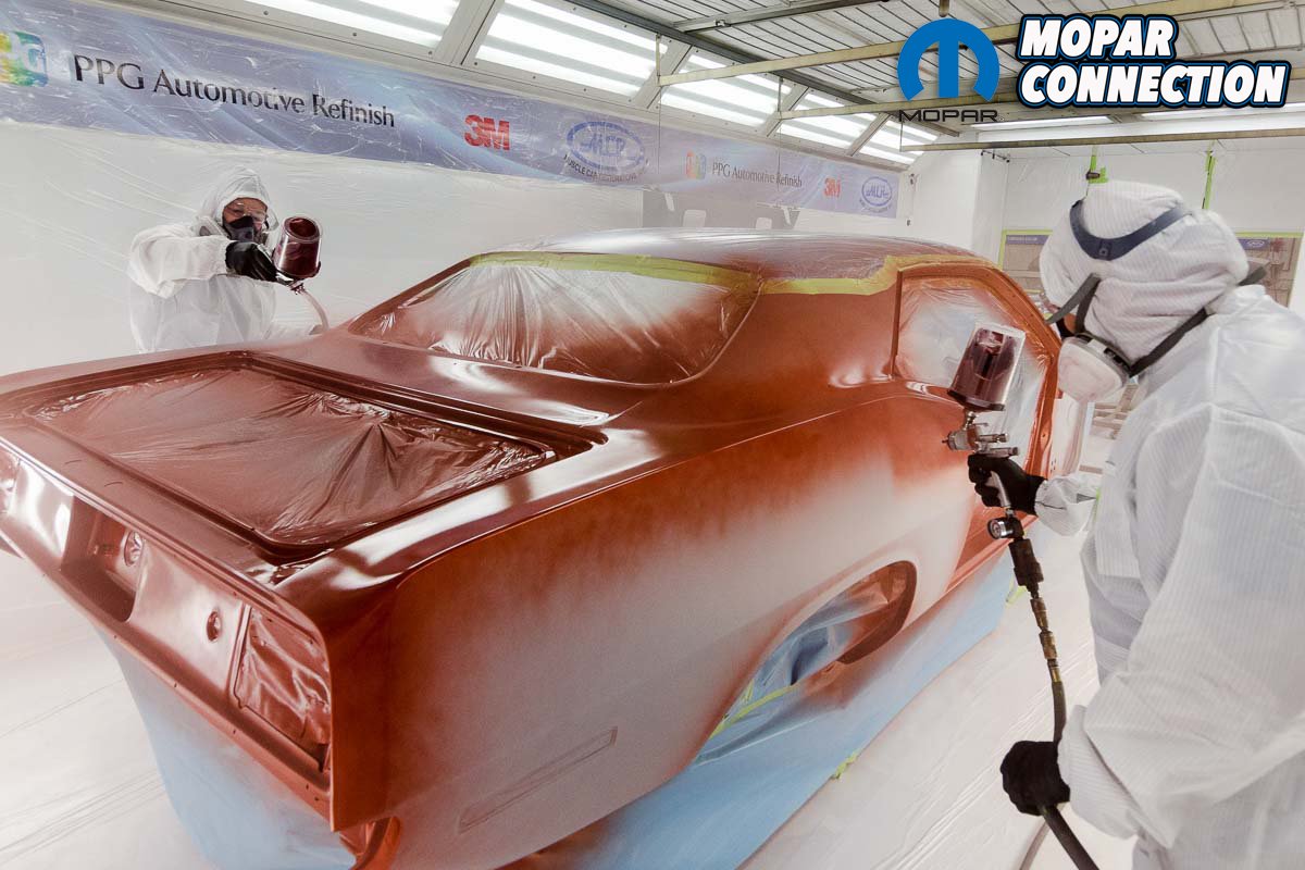 Above left: Just as with the color, two painters apply the clear to be sure that all of the pattern edges flow perfectly together. Note that the top was painted earlier with a single-stage product as John’s car will be getting a vinyl top. Three coats of clear generally suffice if the owner wants a factory-looking finish. Above center: Four coats would be sprayed if the clear coat is cut and buffed to a high gloss mirror finish. Now that the exterior panels have been sprayed the car is given time to cure before getting masked off. This lets us spray the interior, undercarriage, and engine bay. Above right: The undercarriage on this ‘Cuda receives the same three coats of both base coat and clear coat to ensure the best coverage all around.