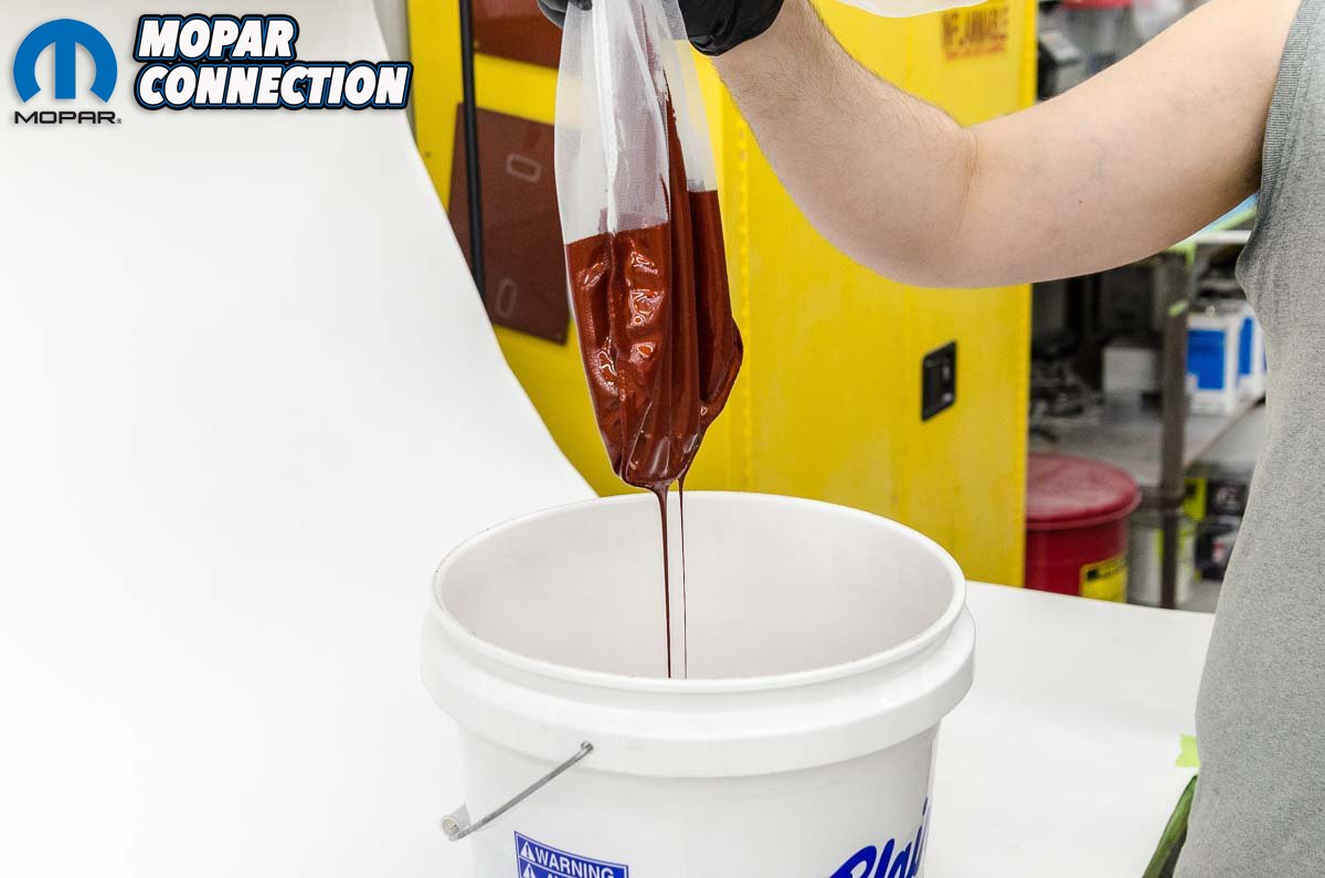 Above left: All of the product to be sprayed is mixed into a single container to ensure that the color remains absolutely consistent from beginning to end. It is strained to be sure that any possible clumps of metallic material are removed. Above center: Mixing is done strictly according to PPG’s instructions. Above right: The paint is strained yet again as it is poured into the paint cups. Enough paint is brought into the booth so that the coat can be finished without anyone needing to leave before it’s completed.