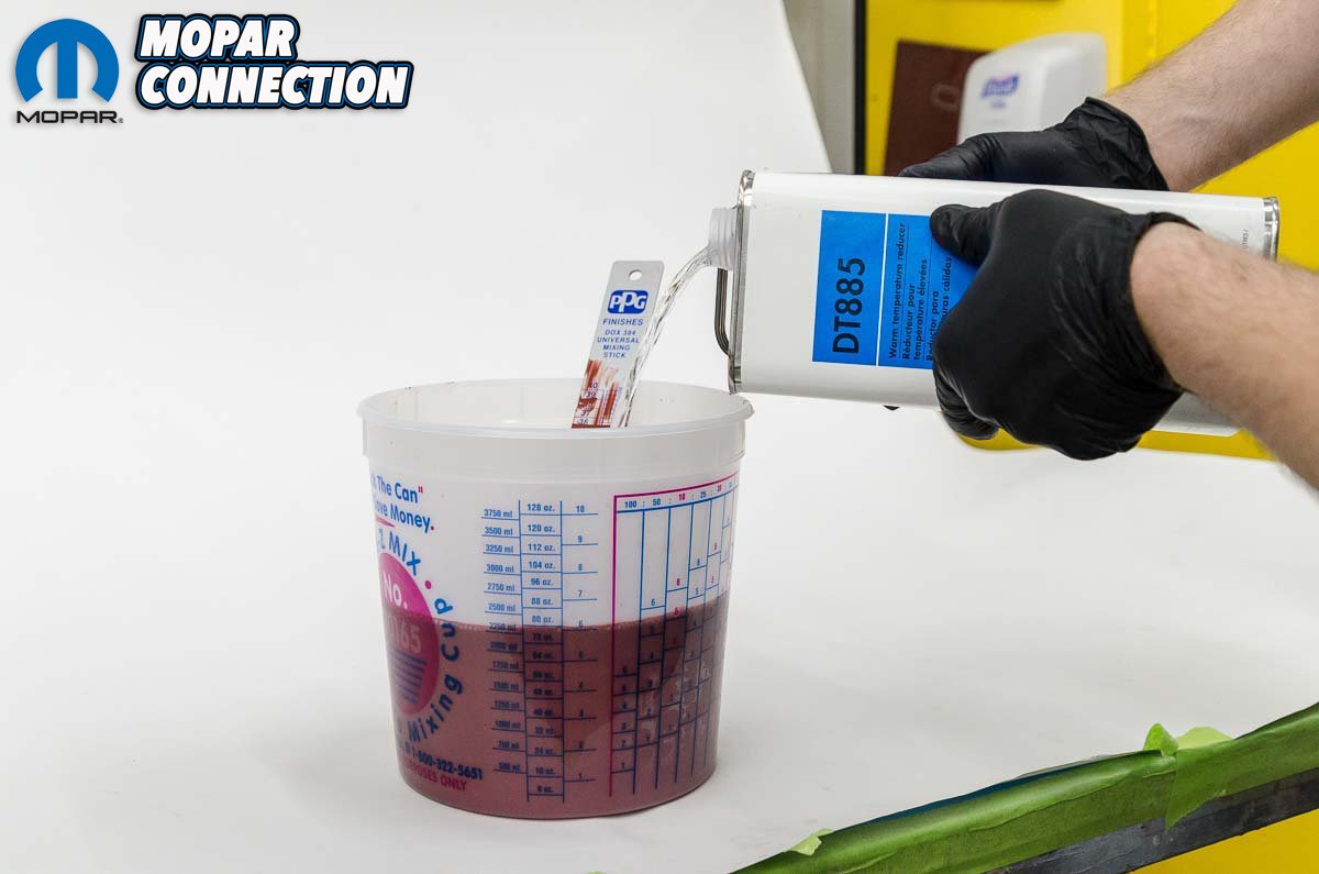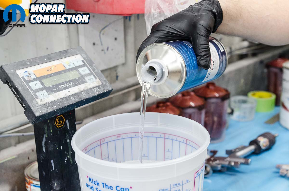 Above left: Speed shapes are also used to show the test colors in a three-dimensional form. Your car is not a flat object. These shapes not only show the highlights/shadows but also how metallics/pearls/etc look in three dimensions so there are no surprises once it’s on your car Above center: The clear coat utilizes a hardener as well as a reducer. Above right: The hardener and reducer are mixed by weight, not by volume. PPG provides very specific data on how to mix these products to achieve the best results.