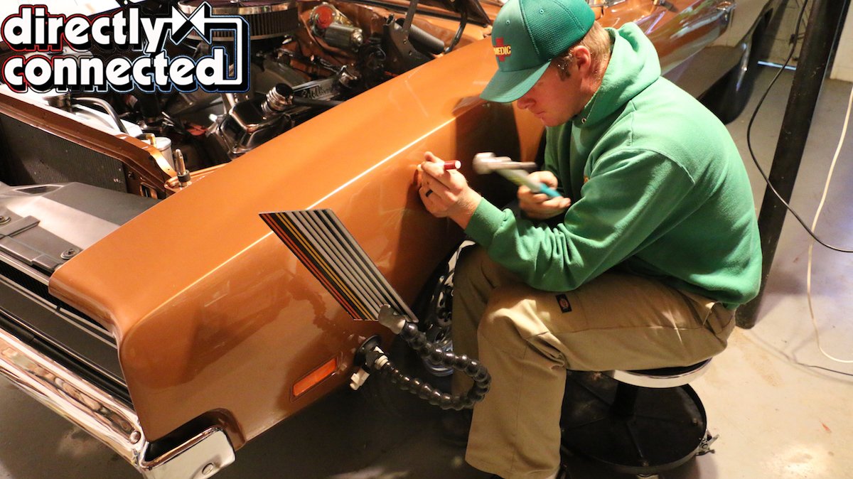 Thayn looked over our Project Brazen ’69 Dodge Charger R/T confident that the long depression in our upper left fender and the 4-inch vertical crease in our right quarter panel would come out with a couple hours’ work. Although the paint job is only six years old, chips and sanding marks show it to be very thin. Cautious, Thayn assured that going slow and using soft, interchangeable tips on his tools would keep the paint from cracking or splitting. “I just need to be able to get behind the dent and slowly work the metal back in to shape.”