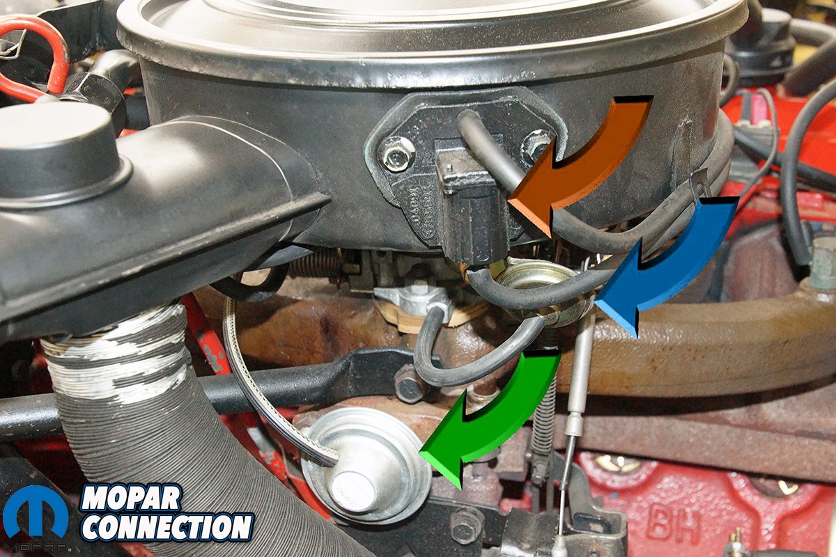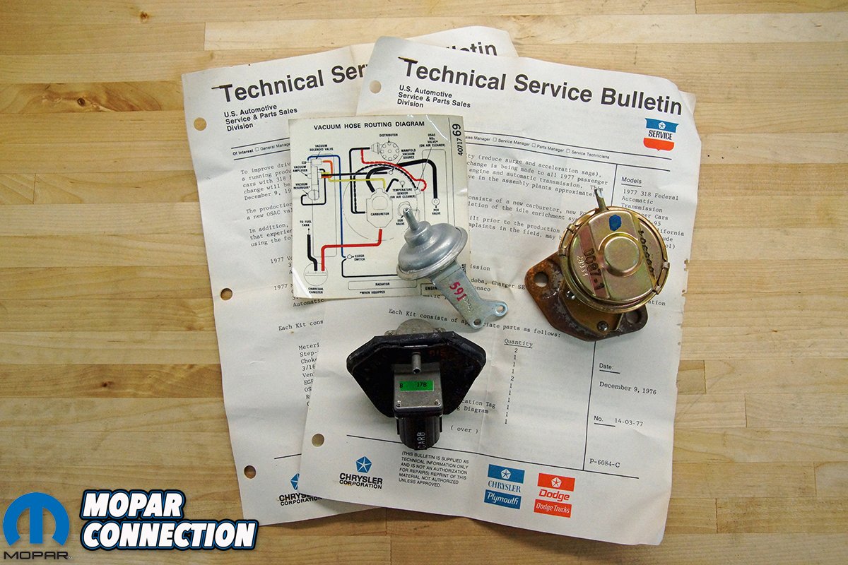 Top Left: In an attempt to improve drivability of the emissions laden 1970s Chrysler products, several technical service bulletins (TSB) were issued in regards to the OSAC valve, the choke pull-off, and the EGR valve. Top Right: The 1970s manufacturers over utilized vacuum for most of the emissions components. We used the capped port for our vacuum gauge. Bottom: The Dart spent long hours on the dyno.