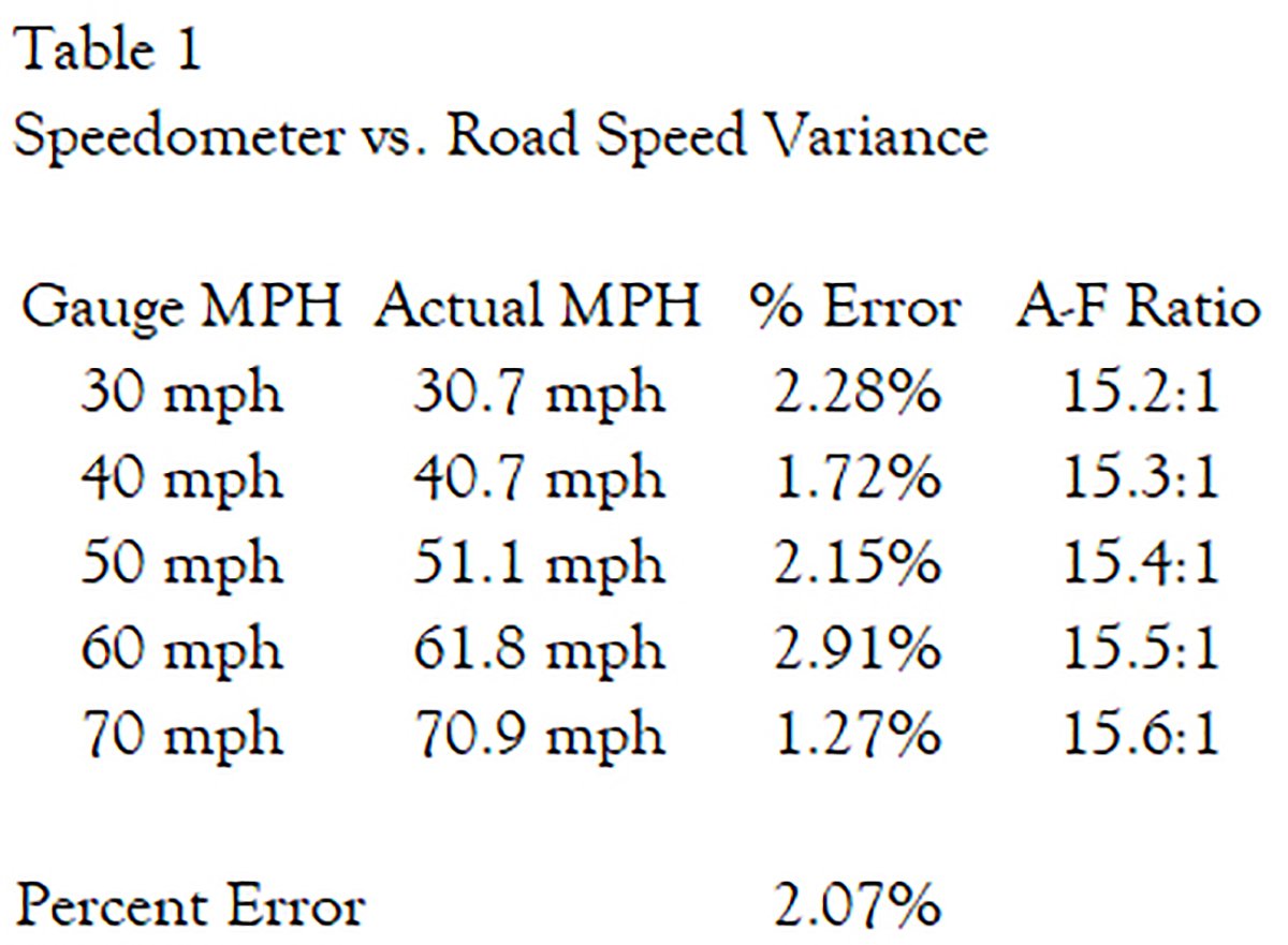 Top: Determining the correct gear to use can be aided by a factory shop manual (FSM) but since all of the older vehicles came with bias-ply tires and now likely run on radial tires it still might have a slight variance. Bottom Left: If the variance had been significantly off, we would have had to replace the speedometer pinion gear in the transmission with a pinion gear that had a different tooth-count. Bottom Right: The speedometer’s odometer was used for mileage calculations, and it was off by 2.07%. Included in this table are the air-fuel ratios while cruising at each 10 mph increment.