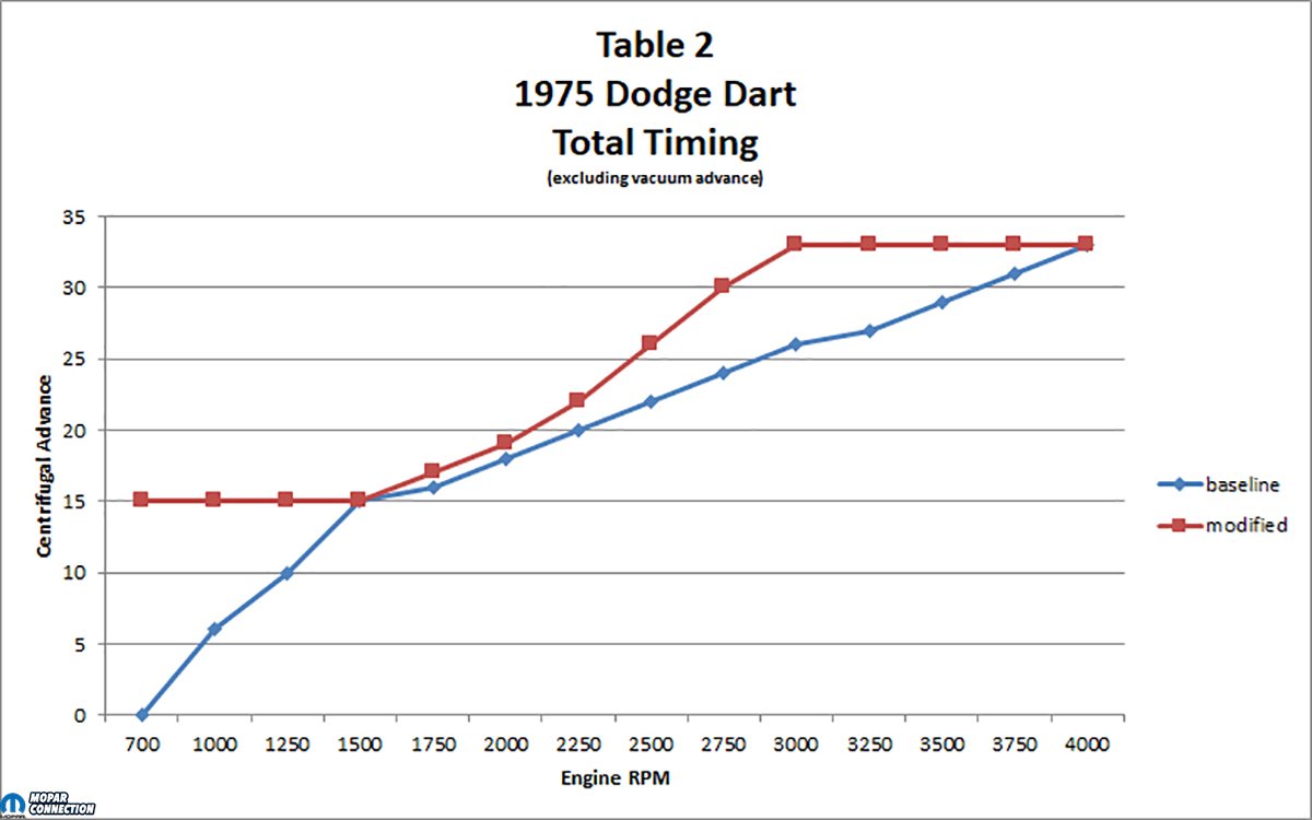 After the dyno tests, we determined the minimum initial timing that the slant six desired. This engine was quite content with 15° before TDC (BDTC) initial ignition timing. We established that the 1975 225 preferred 33° of total timing, and the distributor had way too much centrifugal advance built into it, which required the distributor to be pulled from the 225 and proceeded with our modifications to limit the centrifugal advance to 18°.