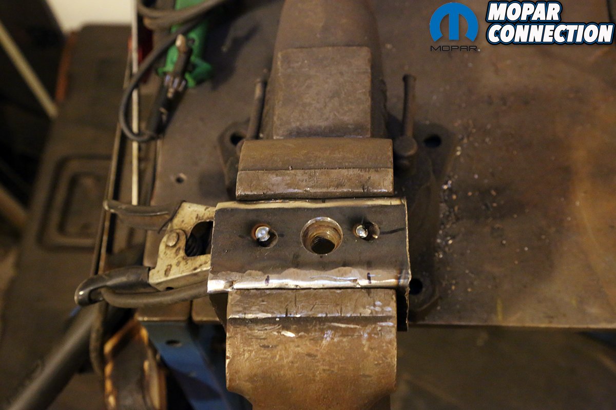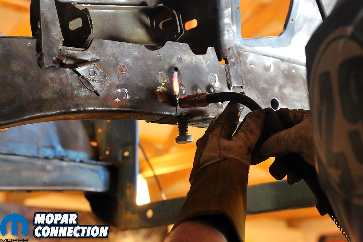 Above left: The cracks were drilled, along with several spot welds for the side of the repair channel. We want this repair to be solid with no chance of moving or cracking out again. Above right: After the channel was installed and aligned to the measurements, the frame was clamped tight to the channel and welded up. The factory subframe is only 14-gauge, so too much heat will warp the channel. We only welded an inch at a time.