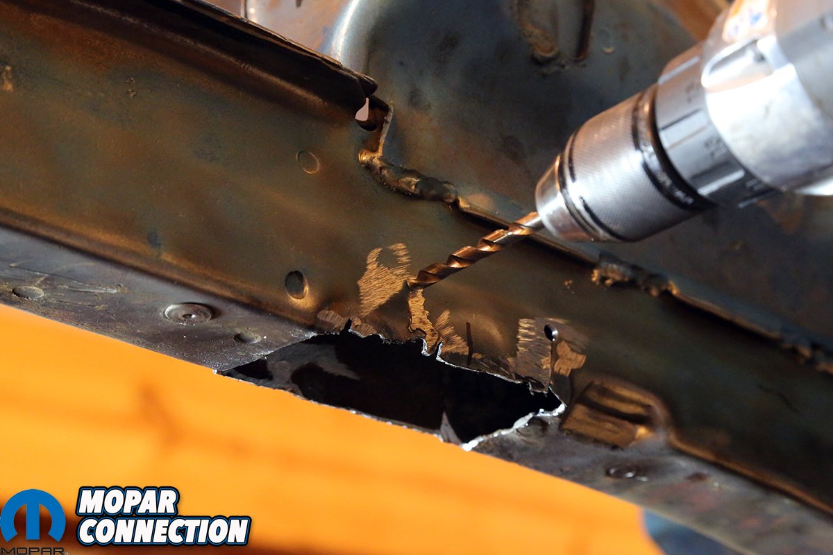 Above left: The remaining section of factory subframe was cut away using the rota-broach spot weld cutter. A center-punch makes this task much easier, as the alignment pin needs a divot to ride in. Otherwise, the cutter will walk all over the place. Above right: The backing plate was then welded into the repair channel.