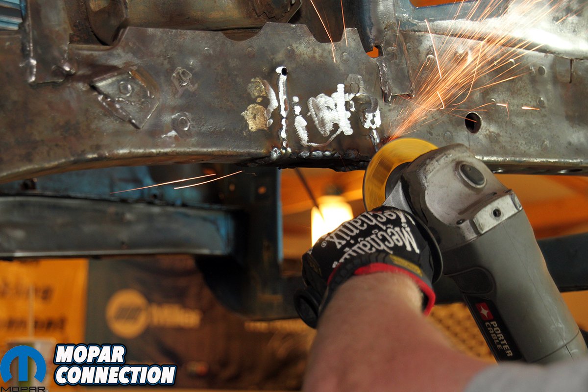 This 1969 Road Runner had lead a hard life before it was chosen for a major rebuild. The subframe looked like it was in excellent shape until the K-member was removed. That was when the passenger side rear mount fell out of the subframe. The subframe had been stressed from hard driving to the point that the metal was so weak, the backup plate for the K-member bolt ripped free from the rest of the subframe. There were a total of 8 cracks in the side of the subframe channel. The rest of the subframe was in perfect shape, but this was an unsafe situation. Rather than cut out the entire subframe, the decision was made to repair it instead.