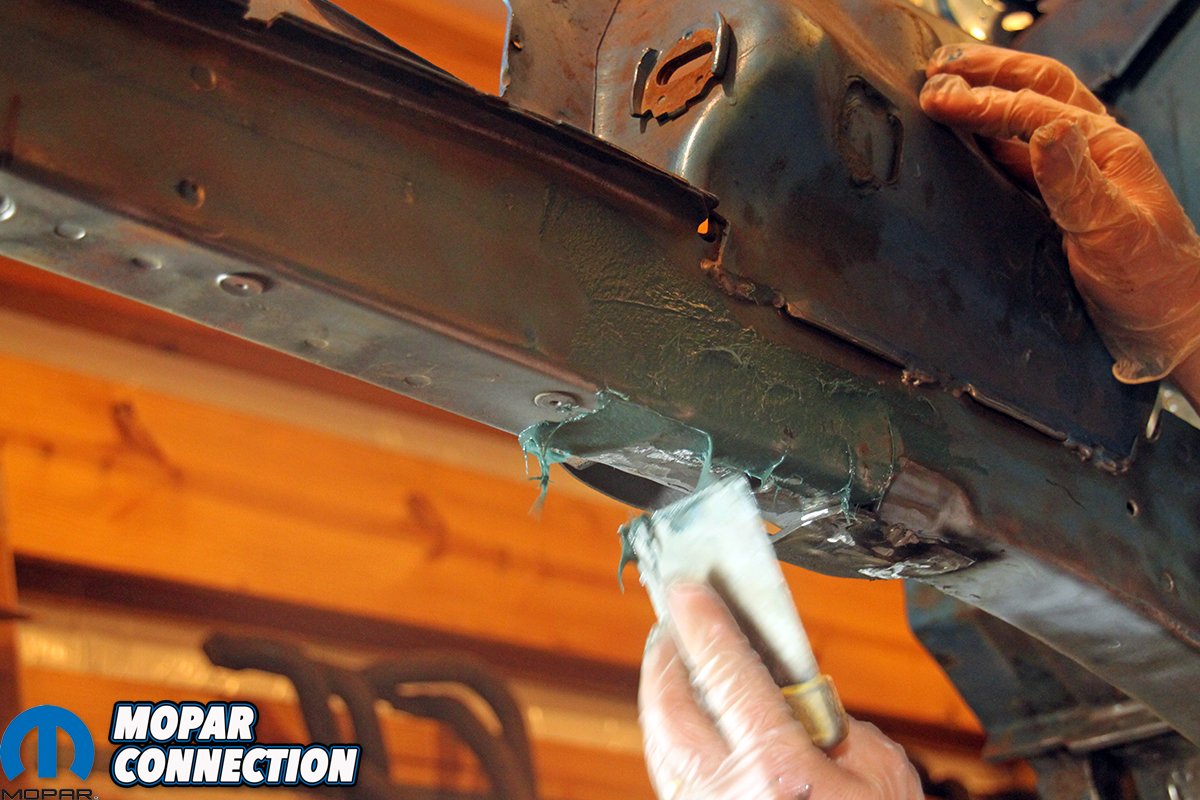 Above left: A high-zinc weld-through primer was applied and the original bumpstop bracket welded back into position. Above center and right: The last step was a coat of fiberglass-reinforced body filler (Duraglass). This filler is water resistant, fill pinholes and is more durable than standard