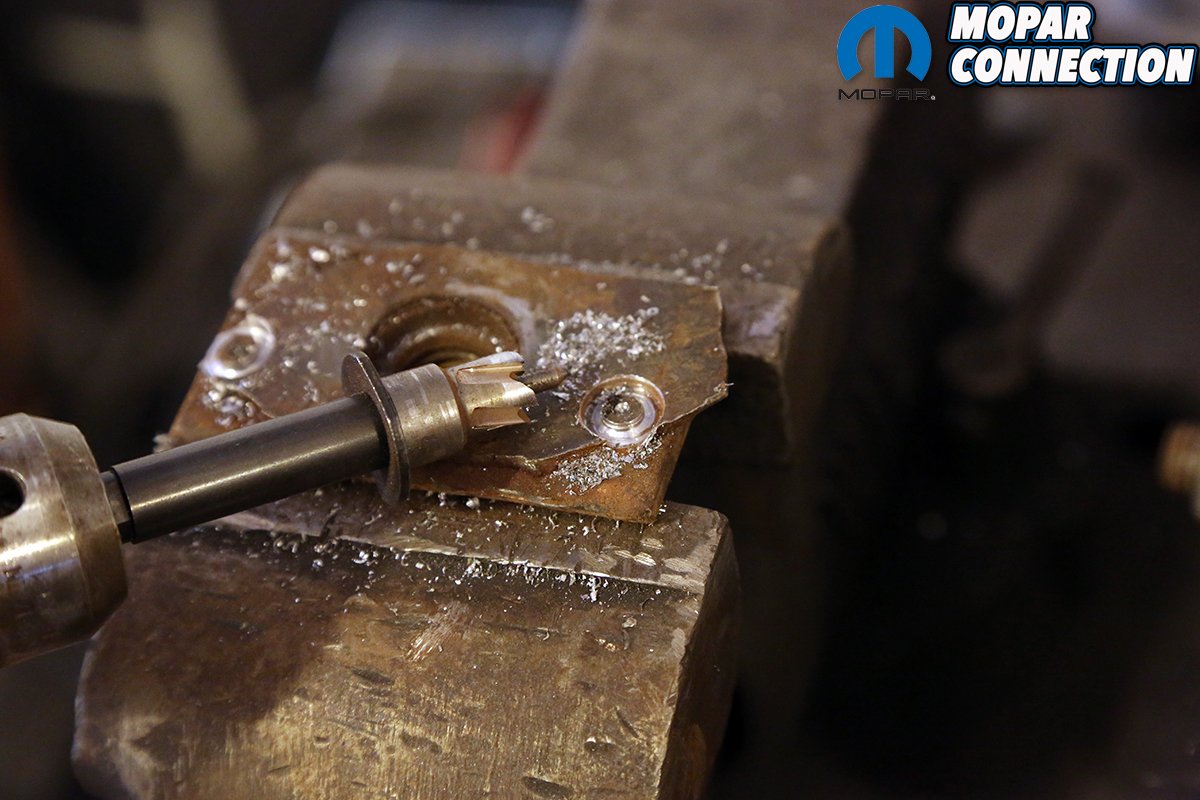 Above left: The repair channel slide up into the subframe and was marked for the bolt location. Above right: Using a large rota-broach cutter, the channel was cut for the bolt hole. This mimics the look of the factory subframe. We also drilled 2 holes for the spot welds, just like the factory.