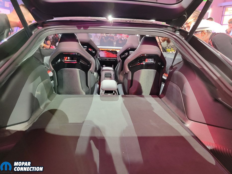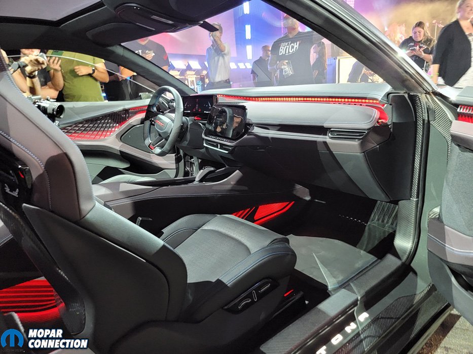 In terms of interior technology, it should come as little surprise that the Dodge Charger Daytona SRT Concept has the best that Stellantis has to offer. A new, thin-bodied, flat-bottom steering wheel is positioned over a 16-inch curved digital gauge cluster screen and next to it, a 12.3-inch infotainment screen running the latest UConnect 5 software.