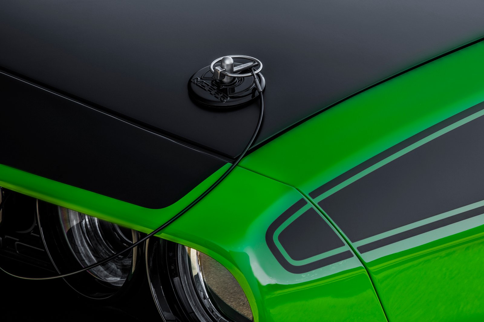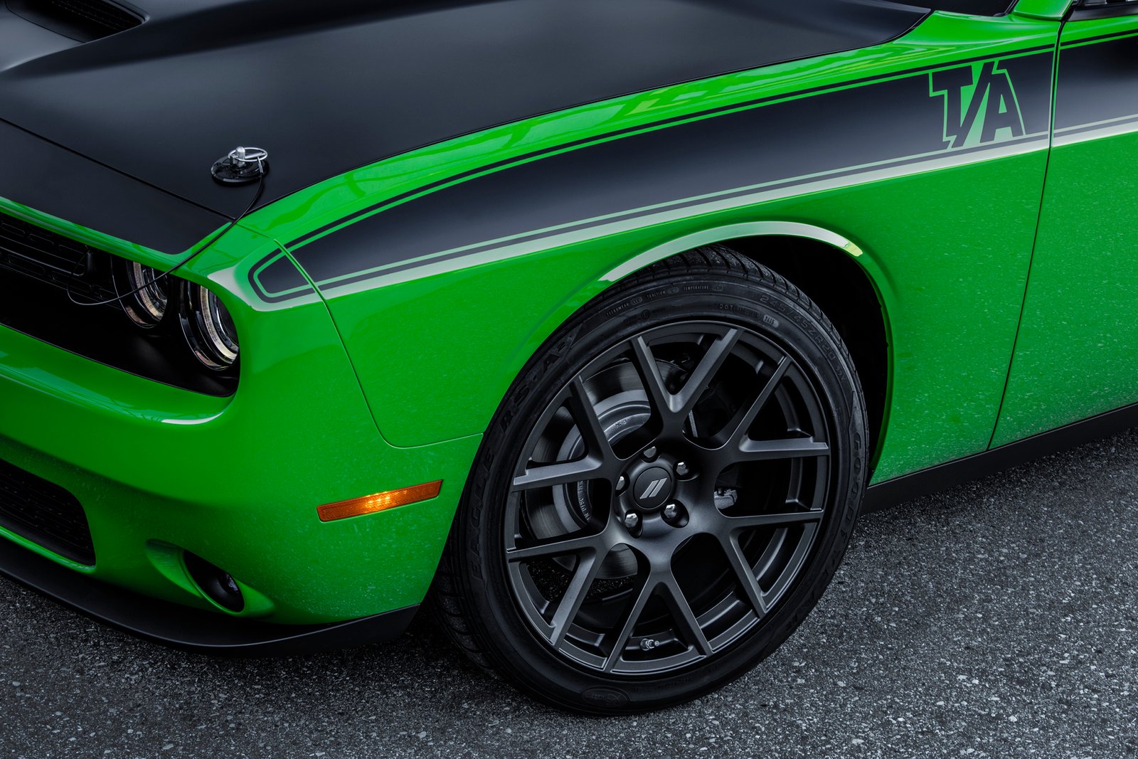 Heritage-inspired Dodge exterior appointments include a new Satin Black painted hood and Satin Black front fascia, roof and deck-lid graphic paired to the T/A bodyside stripes; new wheel center caps featuring the Dodge stripes; “Challenger” script grille badge; Satin Black fuel-filler door with heritage “FUEL” lettering and black deck-lid spoiler with Challenger T/A badge. For an even bolder throwback look to the original 1970 model, factory-installed hood pins are available, along with all-new and limited-production Green Go and Yellow Jacket High-impact Paint choices.