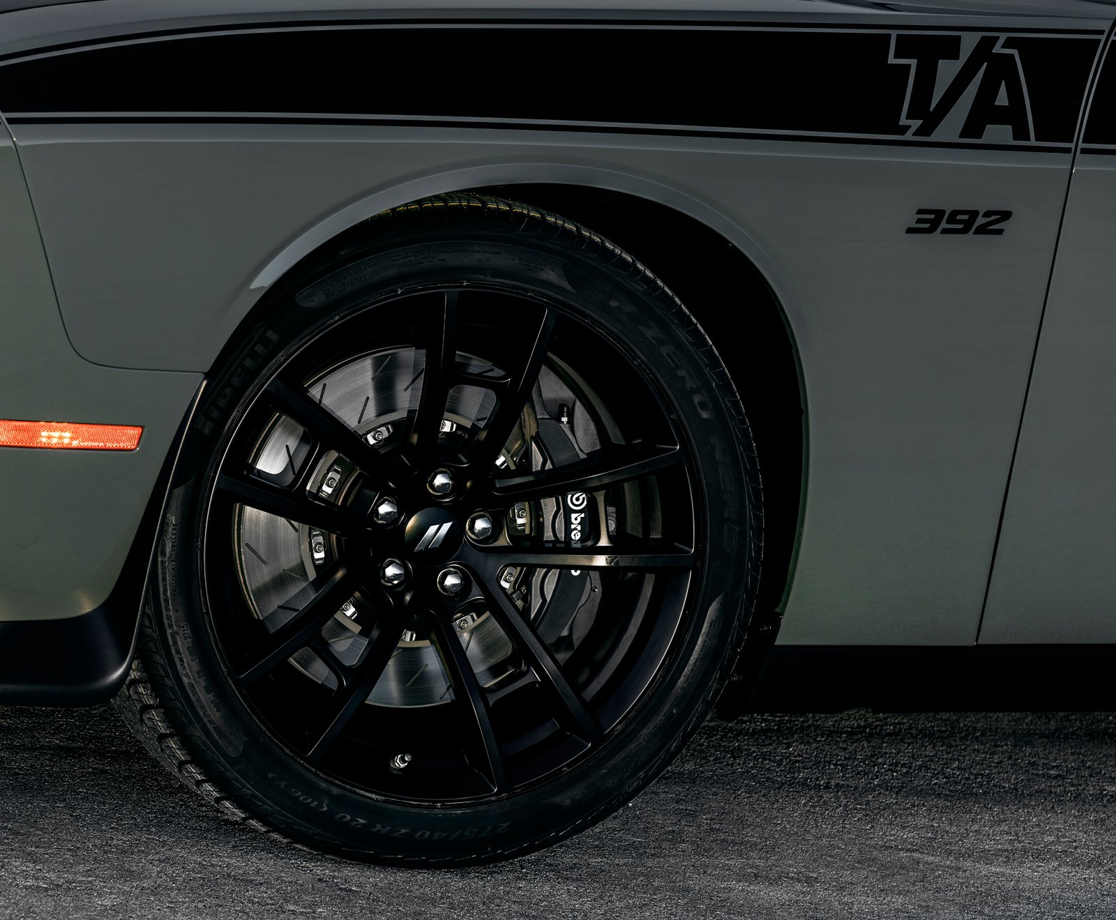 The new Challenger T/A 392 ups-the-ante with 485 horsepower and 475 lb.-ft. of torque which allows it to turn mid 4-second 0-60 mph times and low 12-second quarter mile times. Adding to the standard equipment found on the Dodge Challenger T/A Plus, the 2017 Challenger T/A 392 includes ultra-high performance Brembo six-piston front and four-piston rear brakes with vented rotors, unique front suspension geometry, all-new 20 x 9.5-inch forged aluminum wheels finished in Low Gloss Black, P275/40ZR20 Pirelli three-season performance tires, “392” fender decals, 180-mph primary speedometer and an electronically controlled active performance exhaust system.