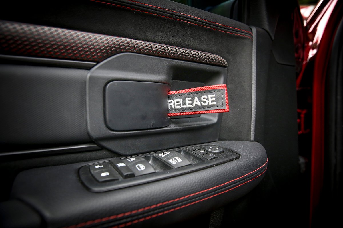 The center console matches efforts on the instrument panel and includes a new polystable shifter trimmed in black suede and Header Red stitching. Designers re-trimmed the Rebel TRX armrests with solid Header Red accent stitching and wrapped the upper bolster in suede to keep arms in place. Nylon-strap door pulls are embroidered with “Release.”