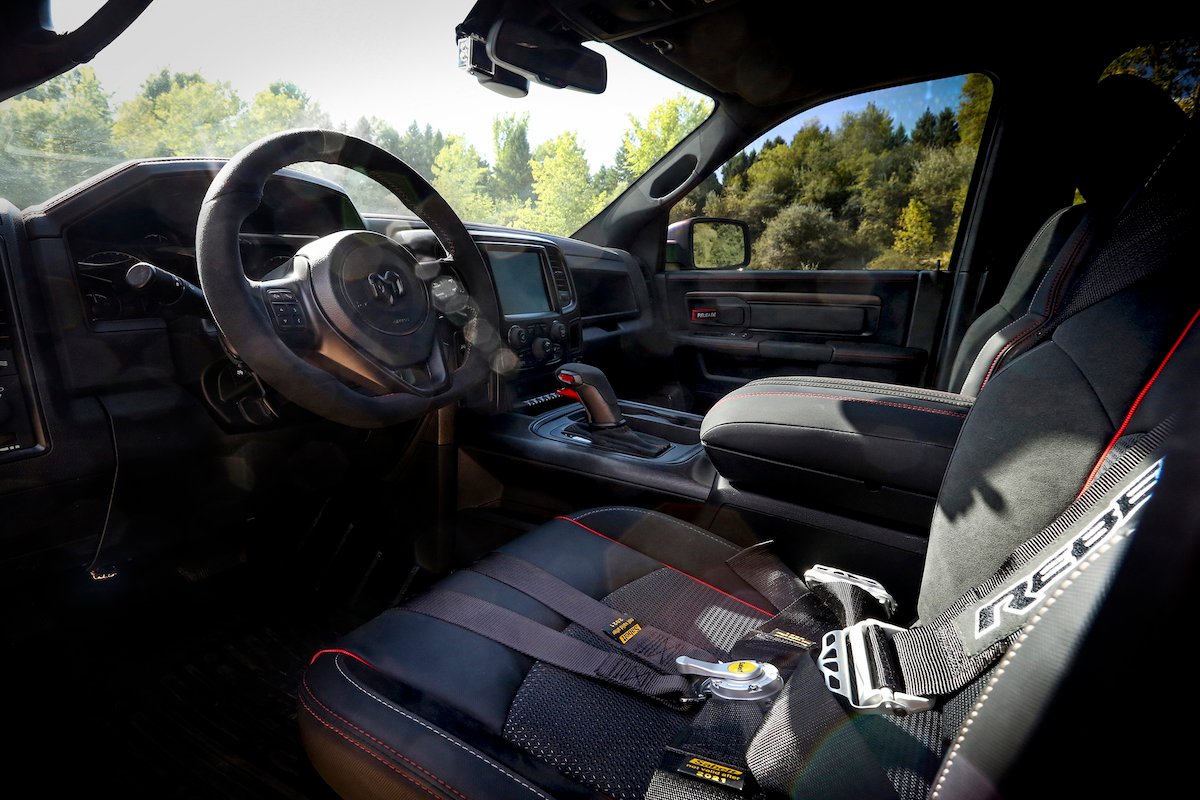 The Rebel TRX interior floor trades carpet for black rubberized coating. Black all-weather mats from Mopar reduce foot slip when foot-to-pedal placement is crucial.