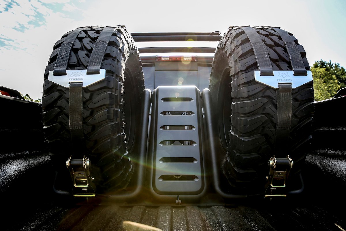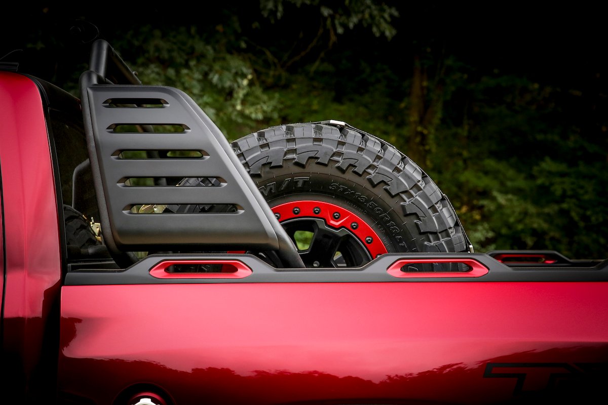 High-speed off-road truck racing teams commonly use a 37-inch tire for its height and durability. Tires with 37 inches of height, 13.5 inches of width, aggressive treads and 10-ply design are assigned the task for Rebel TRX. The Rebel TRX concept also features custom beadlock wheels from Mopar. Beadlock wheels provide additional tire-holding strength by pinching the outside of the tire to the rim. The Rebel TRX carries two complete spare tire and wheel packages. Tools and jack are located in custom, lockable storage between the wheels in the bed.