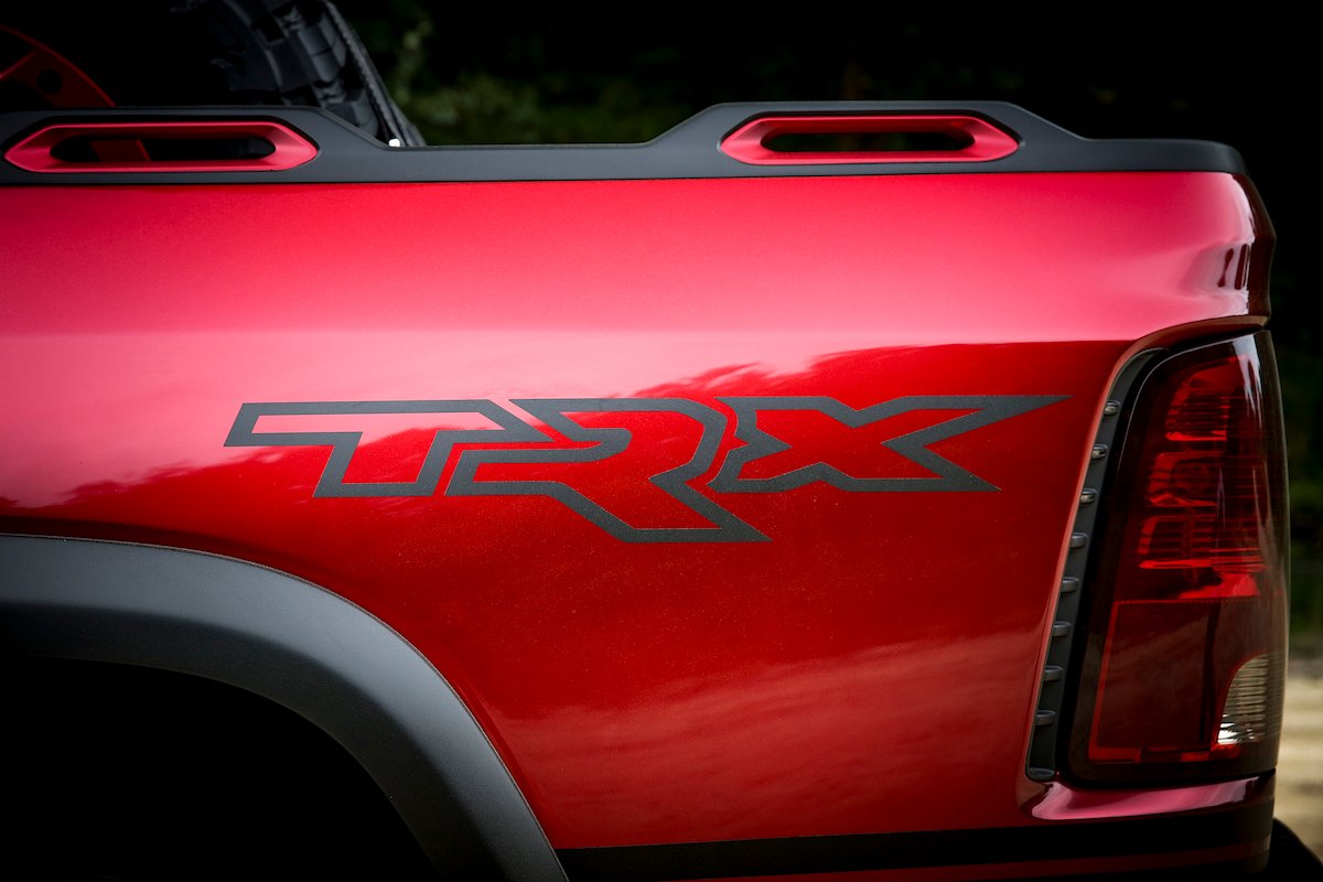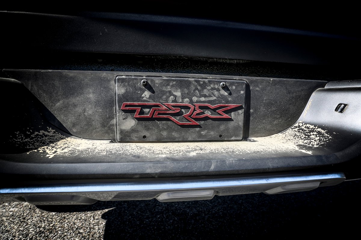 An open upper glove box with elastic straps holds a sturdy TRX-labeled bag with color matched tools. A seven-inch thin-film transistor (TFT) display cluster features muddy tracks and TRX badge graphics. The same graphics fill the screen on an 8.4 Uconnect. To record TRX’s accomplishments, a custom camera mount is located at the rear-view mirror.