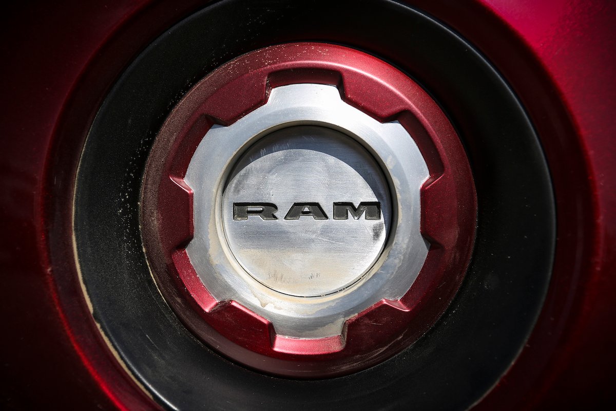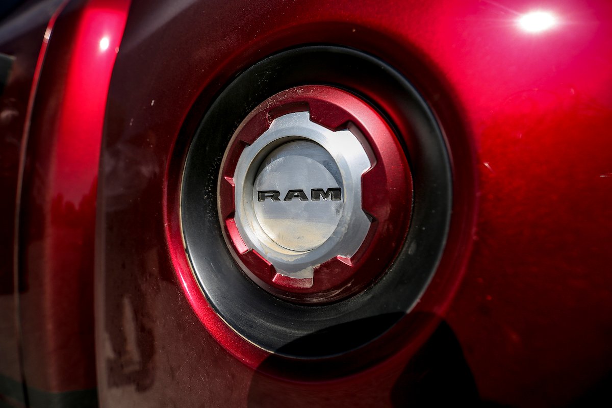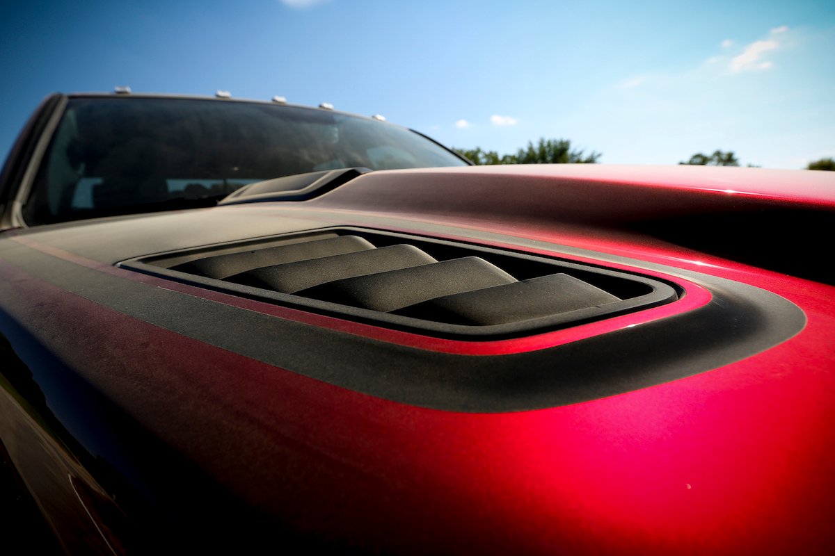 Three letters burst clear of a Power Wagon-inspired grille spelling “RAM” in body-matching black and red. Out of necessity, the bold, scooped grille allows a fire-breathing supercharged engine to cool with additional air flow. Composite flares help compensate for a six-inch increase in track width and gave designers another location to mark their signature. A lower brush guard is forged in steel and up to the “rock knock” test.