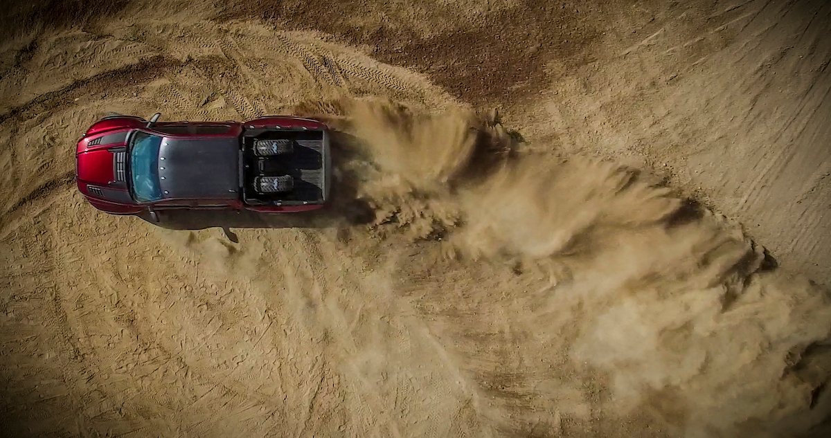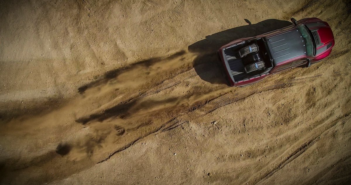To clear the roots-style blower mounted atop the HEMI engine, the Rebel TRX uses a hood based on the taller Ram Heavy Duty design. The raised fender height matches shoulders to chest. A drone’s-eye view exposes bright LED clearance lighting and the acute hour-glass body lines as they dive back into the doors only to pop back out in the back, enabling rear tires to firmly tuck into the wells.