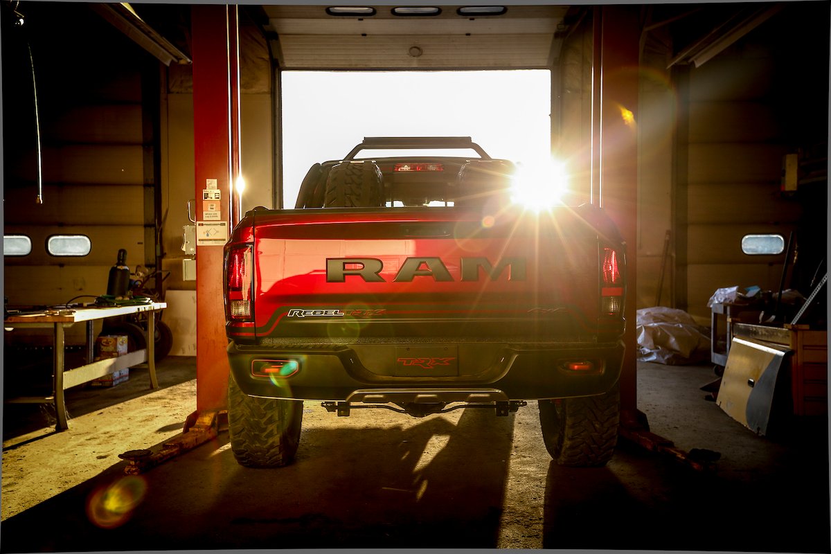 Closing out the rear of the truck, a large “Ram” badge in Matte Black is borrowed from the Rebel and covers the tailgate. A custom rear steel bumper with integrated skid plate and tow hooks matches capability features on the front of the truck.