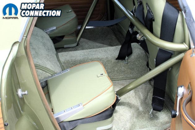 To transfer the power to the wheels, Strange Engineering Hy-Tuf 28-spline axles were used. The rear axle was hung onto a Bear Performance Chromoly 4-link setup with adjustable coil-over AVO shocks and a strong wishbone mount atop the differential, which adds more stability and traction. The car has a hatch to access the four-link suspension from above. To keep the car from flexing, custom connectors tied the two subframes together along with a 12-point roll cage.
