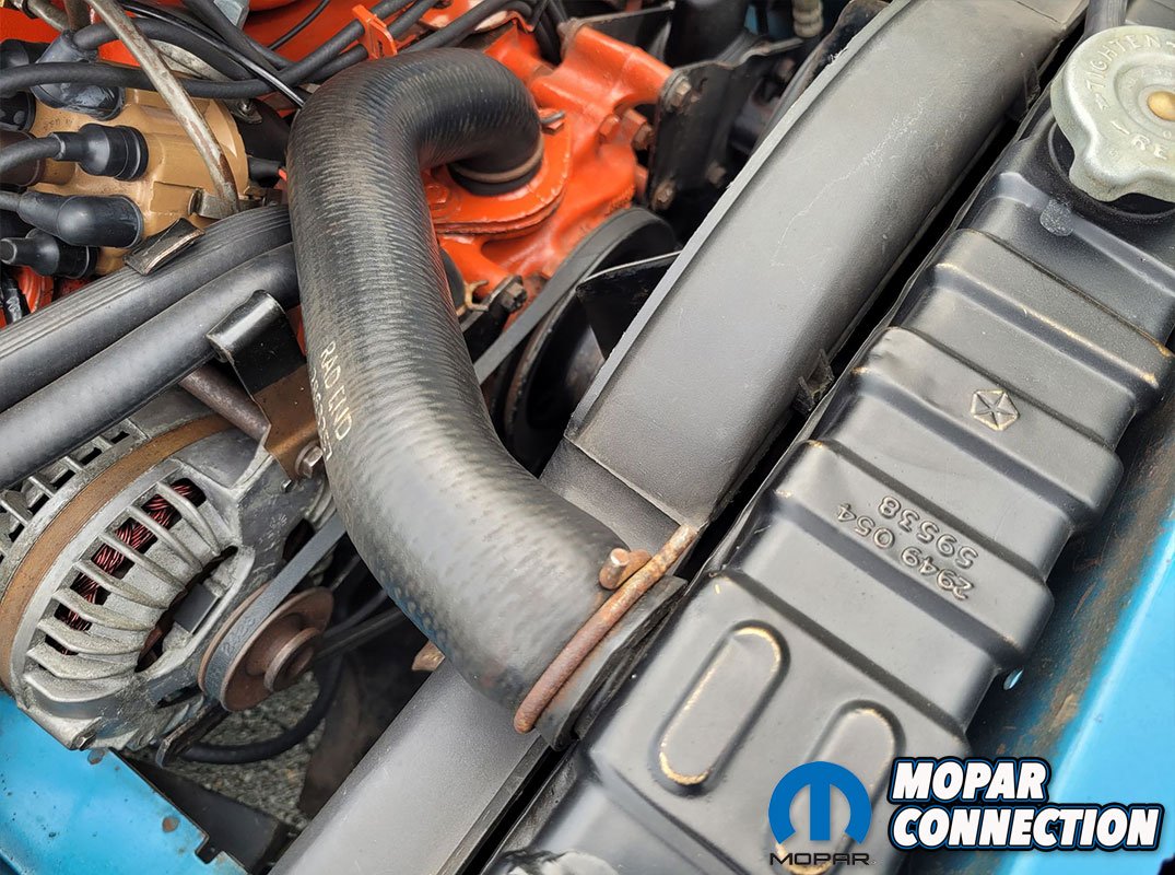 Ed shares, “To keep with the look, I totally gutted a 1977 Mopar 12V battery and hid a brand new high output battery inside it so I’d have excellent reliability while having the vintage look. A correct small font 054 radiator was sourced and installed with original good condition hoses and clamps. It all came together to resurrect a truly incredible A12 Bee.”