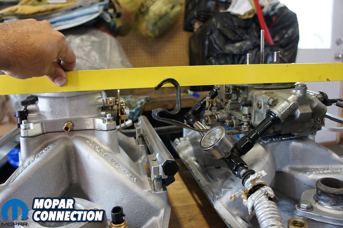 Since there is a fair amount of electrical connections and a new ECU, we started by disconnecting the battery. Remove the intake early on help provide additional room to work around the engine. Be sure to keep the motor covered so no foreign objects fall in. We left the carburetor on the old manifold to compare height against the new Pro-Flo 3 EFI. If you have a stock or low profile manifold, refer to the instructions for checking hood clearance. We were already using an Edelbrock RPM Air-Gap intake and measured only 1/8” higher of the new manifold.