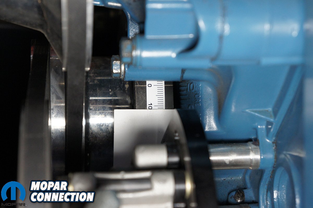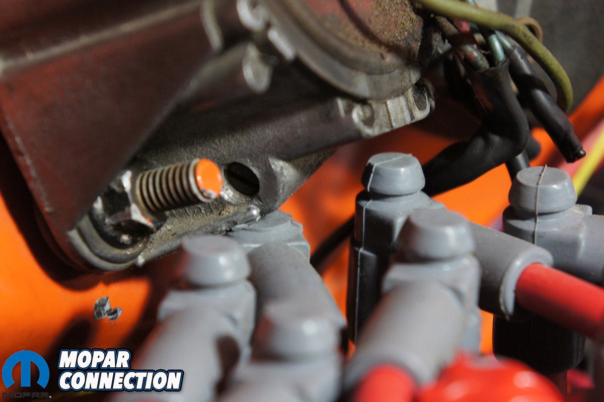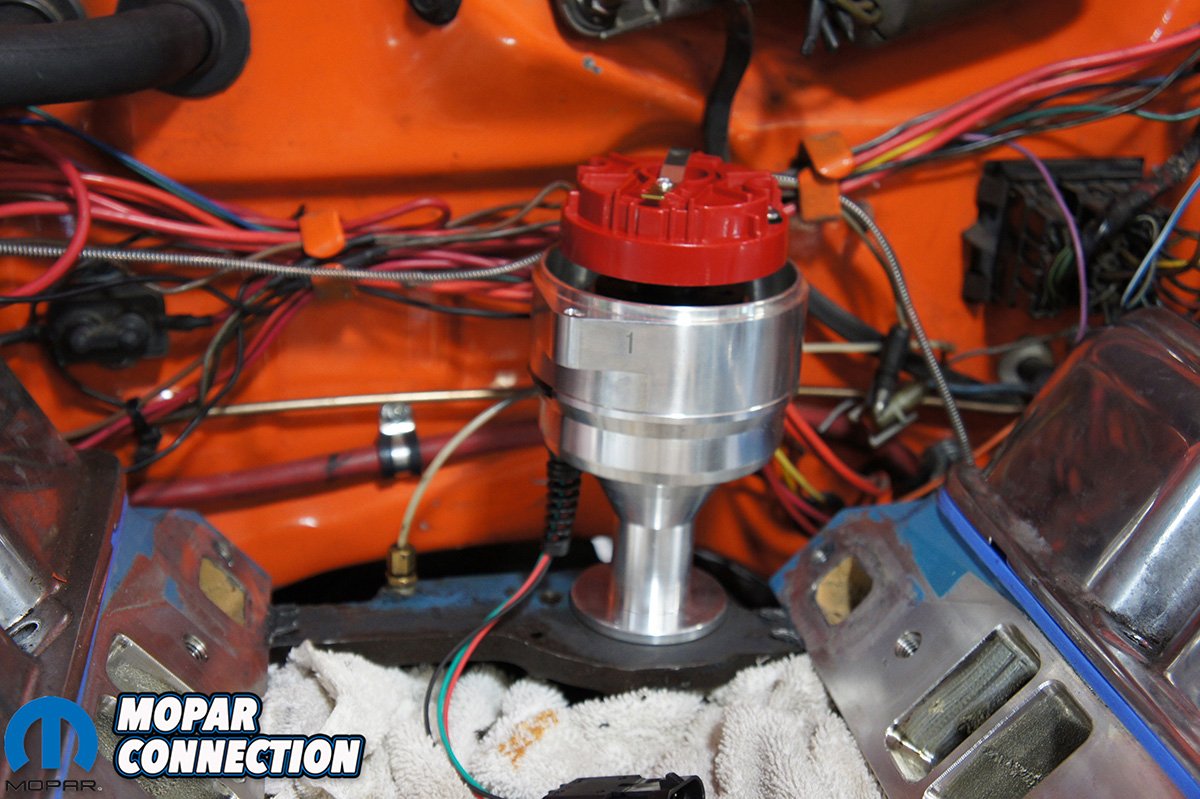Knowing our hood clearance was going to be OK, we had to make sure the motor was timed at 12 degrees Before Top Dead Center (BTDC) before removing the distributor. We rotated our crank to 12 degrees BTDC on the compression stroke and removed the old distributor. We installed the new distributor and rotated the base until the rotor lined up with the stamped “1” on the side.