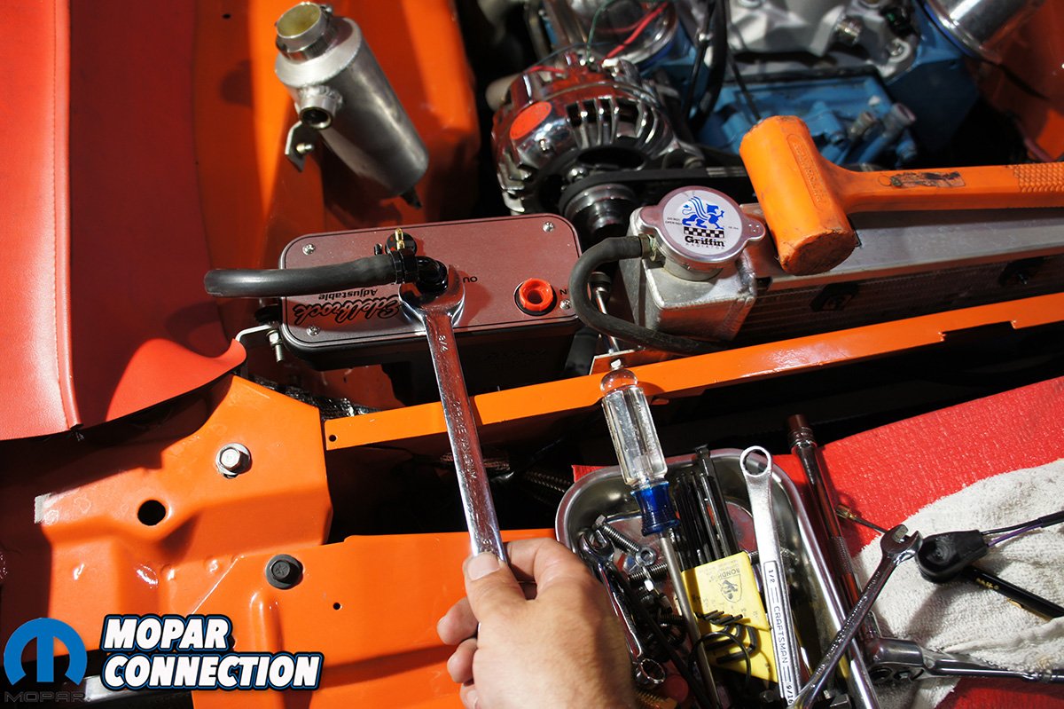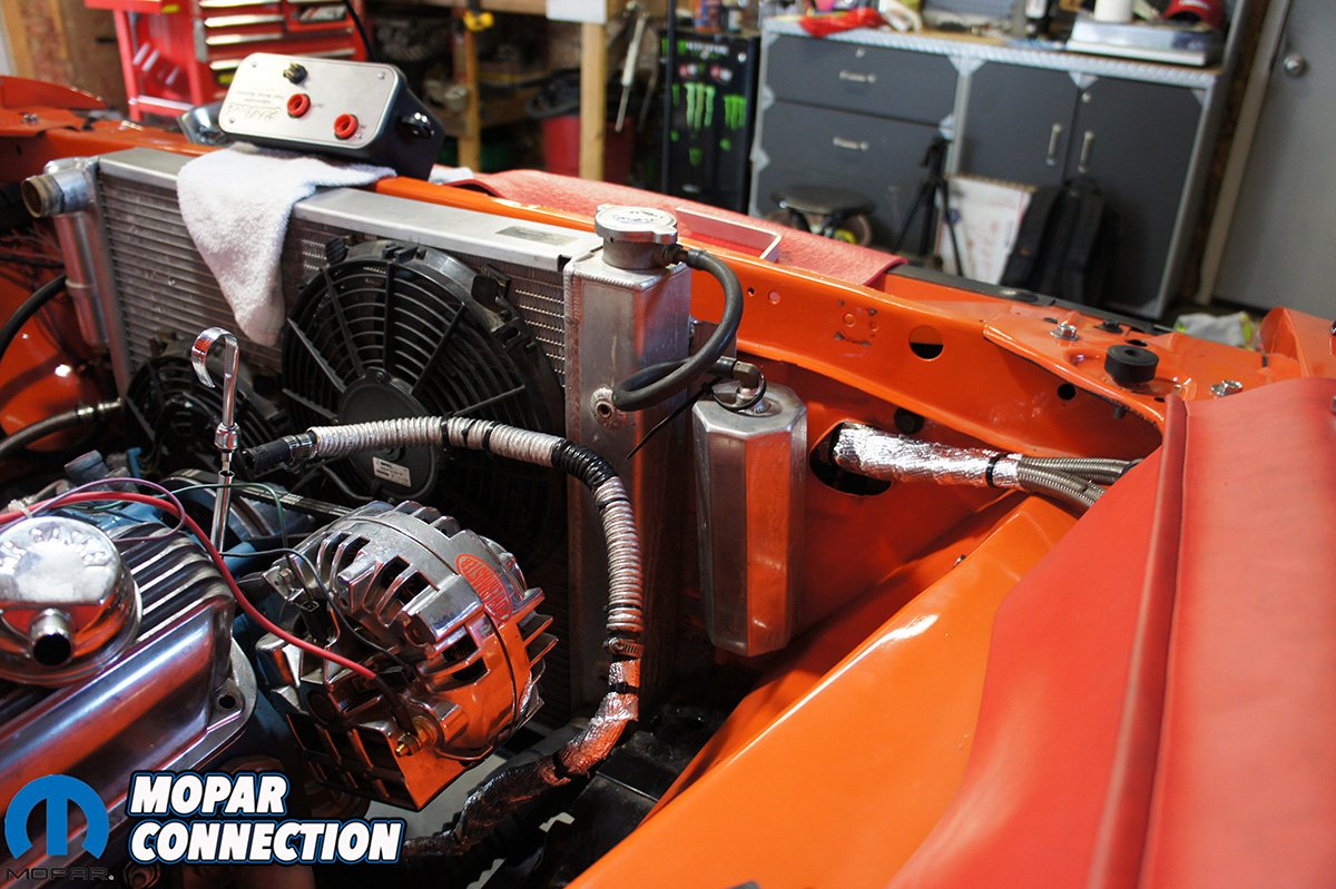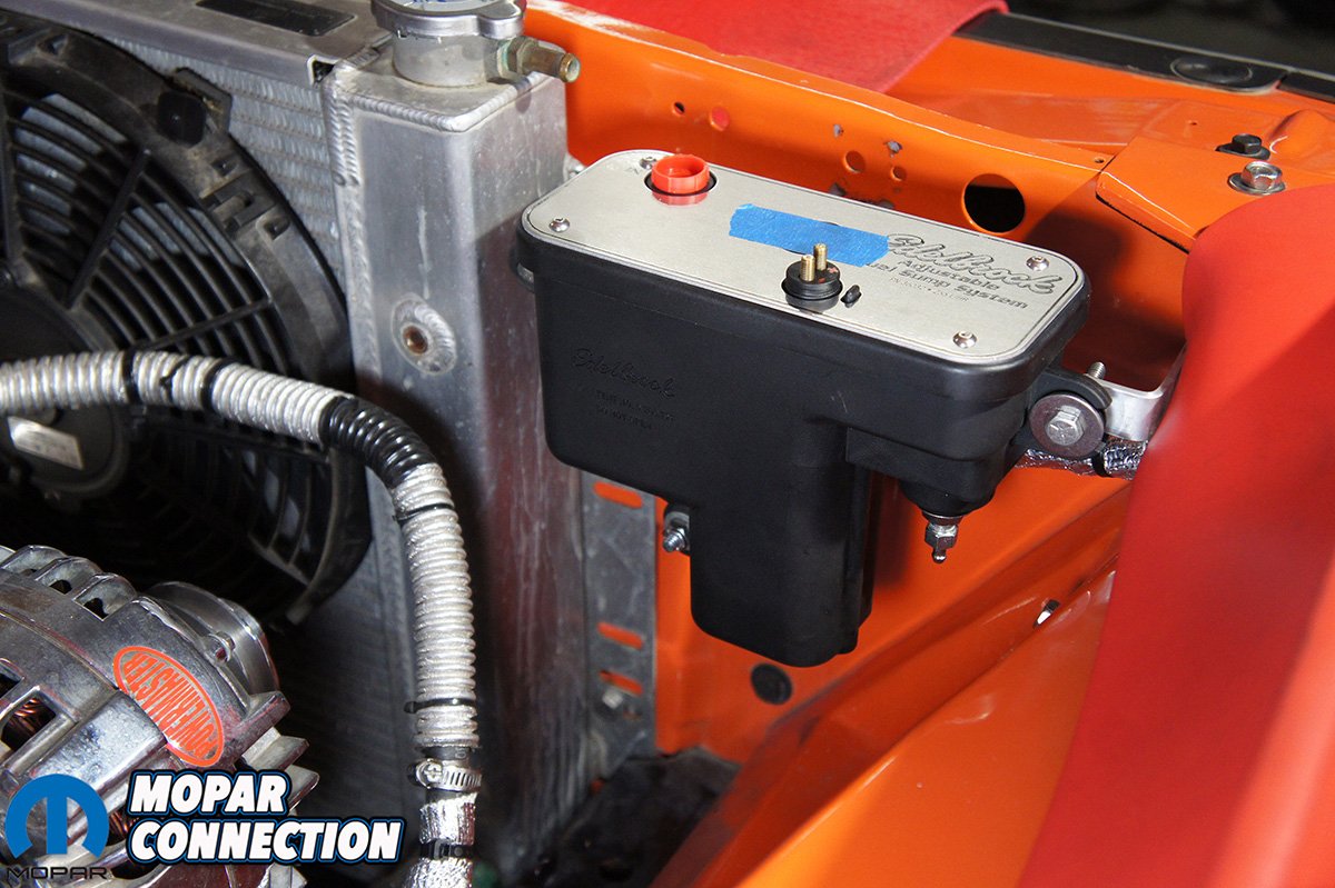 Above: We had to relocate our radiator overflow tank and make some brackets to mount the Sump. Be sure during installation the top of the sump is level.