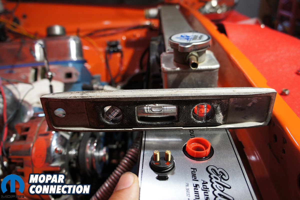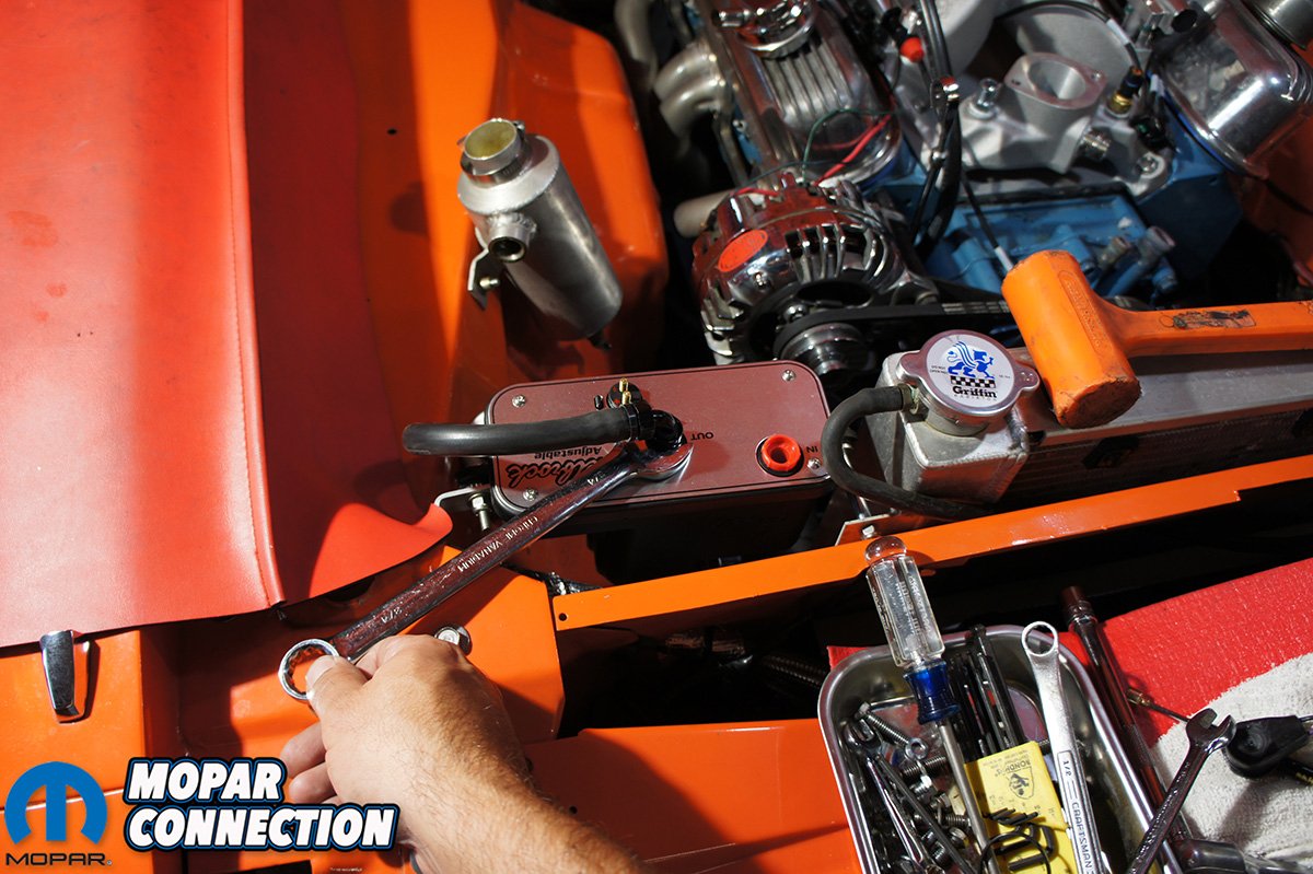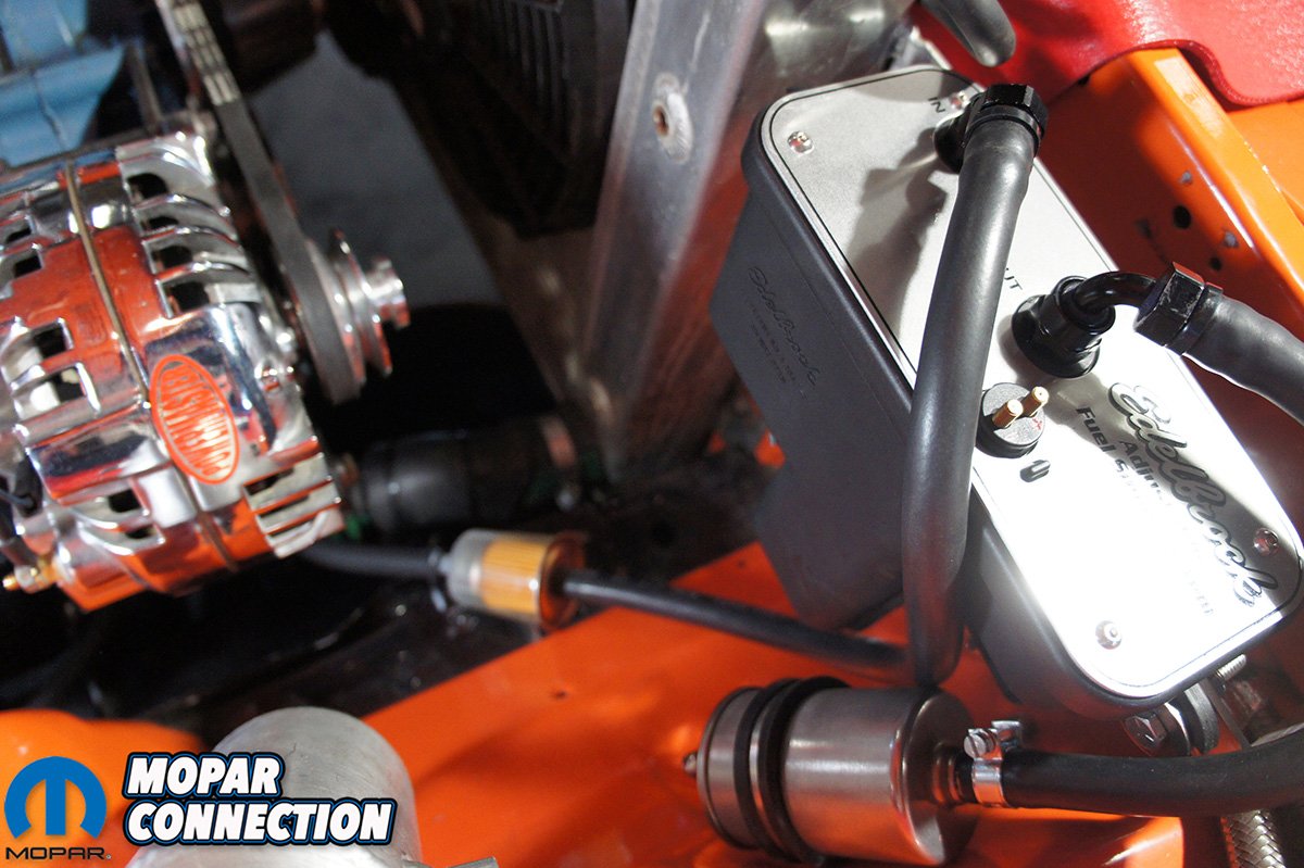 Before we started to remove the intake and install the Pro-Flo 3 EFI, we decided to mount Edelbrock’s Universal EFI Sump first. We used Universal EFI Fuel Sump (PT# 36031) and it came with everything that we needed to run the Pro-Flo 3 EFI. The kit includes the sump, a high pressure fuel filter, fittings, clamps, harness, and 8’ of -6 Twist-Lok fuel hose. Although the EFI sump can be used in conjunction with other EFI systems, out of the box it’s setup to work directly with the Pro-Flo 3 and E-Street systems.