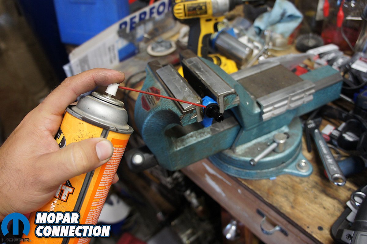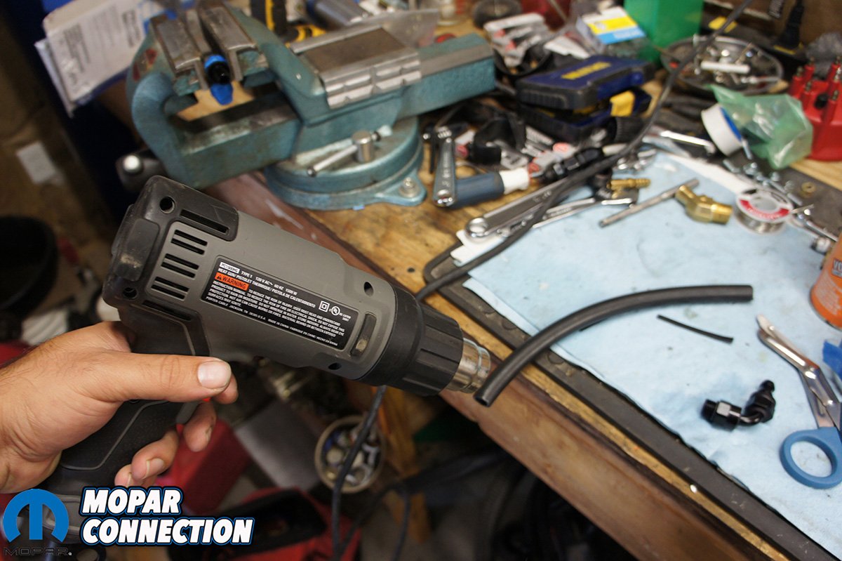 Above: Shoving the hose on the fitting can be tough, we used some silicone spray on the fitting and inside of the hose to help aid us in the process. Be sure to heat all the way around the end of the hose before you shove it on.