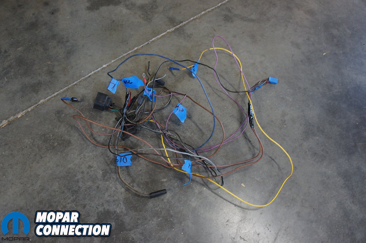 Above left: Here is all the old wiring we cut out of our original harness. Above right: To better visualize the new EFI harness we laid it out on the floor before we laid it in the engine bay.