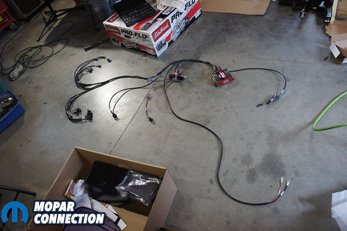 The Pro-Flo 3 EFI system we used for our small block Mopar LA 360 was part #3253. All the wiring, tablet, assembled manifold, O2 sensor, distributor, etc. came in one giant box. The only parts we bought were a new set of MSD spark plug wires, new NGK plugs and MSD coil. After opening the box the seeing all the pieces, we did have some worry that it would be harder than it sounded, but it went very smooth.