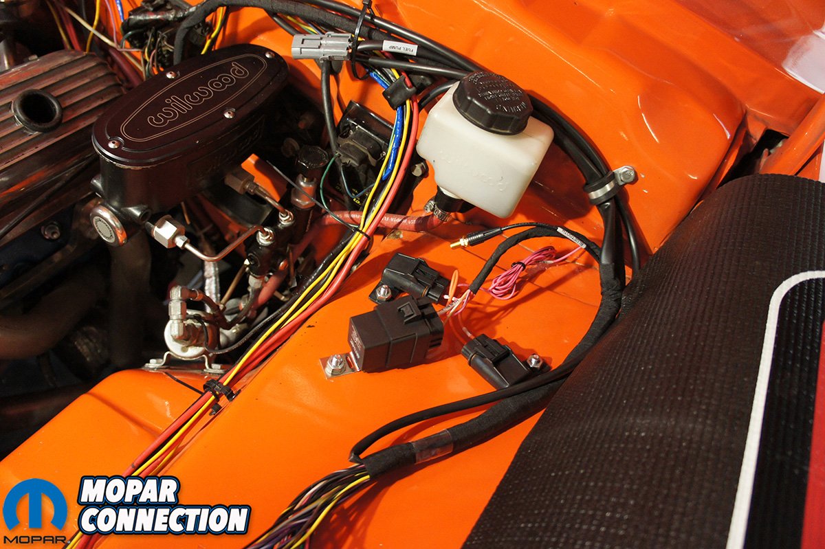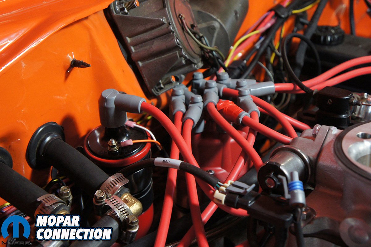 Above left: The Pro Flo 3 EFI manifold also does not have prevision for a coil mount unlike our RPM Air-Gap. It was a tight fit for us, but we mounted it on the firewall. Above right: With our 3 speed wiper motor it was a close fit with our MSD wires. We had to cut the tip of the wire to fit under the motor.