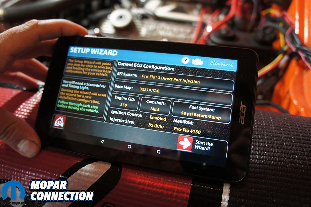 Once your device is charged, refer to the Edelbrock’s Pro-Flo 3 EFI Quick Reference Guide. We can’t say it any better than their guide can. However here is some info on our system to help answer the set up questions: The sump is set at 58 psi, has 35 lb/hr injectors and the manifold is the 4150 style.