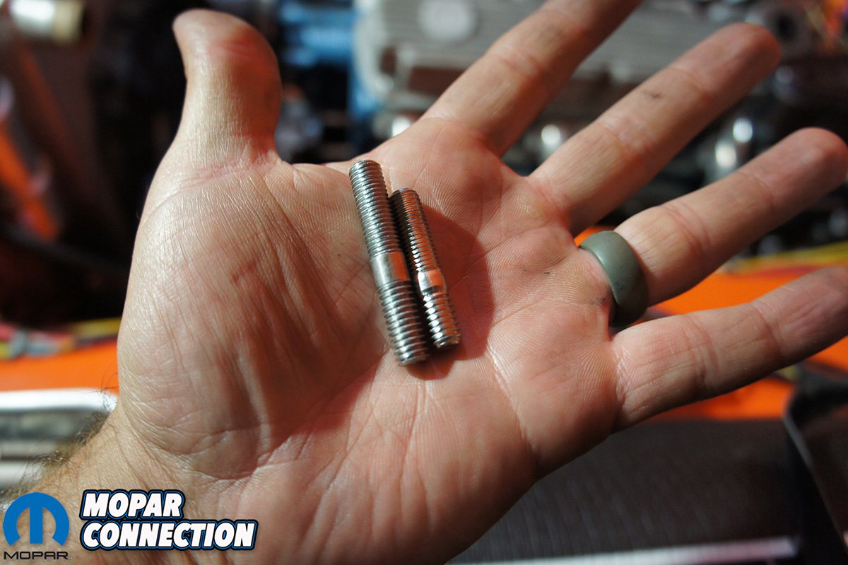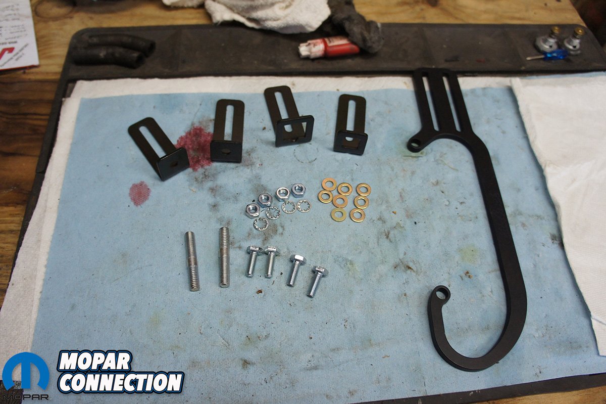 Top left: Comparing the installed stud to the longer one that needs reinstalled. Top right: Our old throttle bracket with the supplied throttle return spring installed. Bottom left: Edelbrock includes their own bracket and throttle cable mounts. It can also be used in conjunction with automatics too. Bottom right: The air inlet temperature sensor installed in our air filter base.
