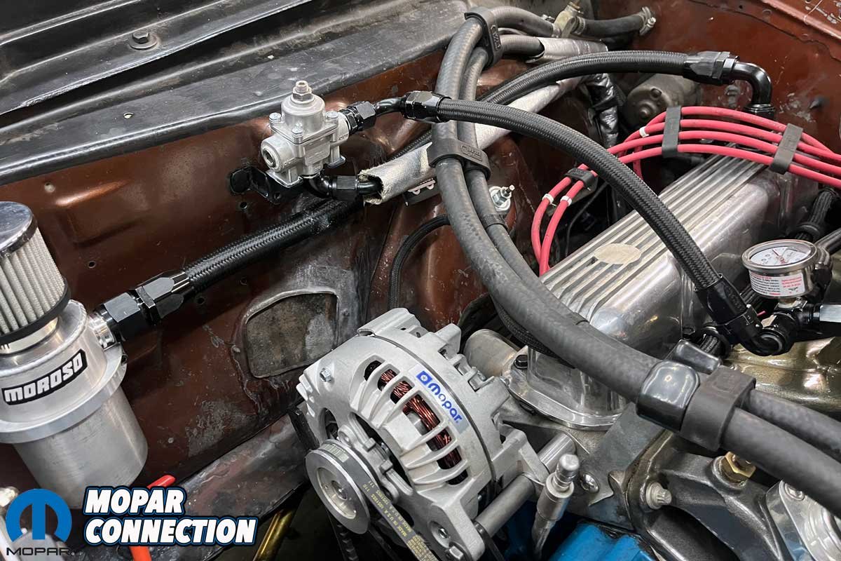 Yet another tech concern was the placement of our fuel regulator. We decided to move the regulator forward in the engine bay. Also, we plumbed the system with an “AN” braided line from the tank to the carburetor.