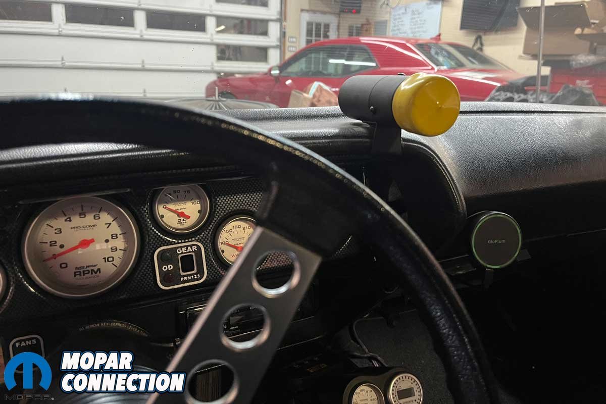 We plumbed a Hurst line lock kit into the brake system for on-track consistency and wired it to a button on the shifter T-handle. We used an AutoMeter Level 1 Digital Pro Shift Controller (part no. 5312) and an externally mounted shift light on the dash, which included a bright yellow shift light.