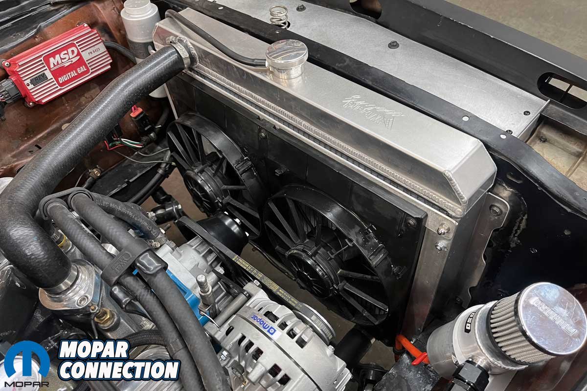 We added electric fans to the previously taxed electrical system, which already had headlights, taillights, trailer lights, a stereo, a blower motor, and an electric fuel pump. We installed an officially licensed Mopar 100-amp Proform one-wire alternator to fix our electrical system challenges.