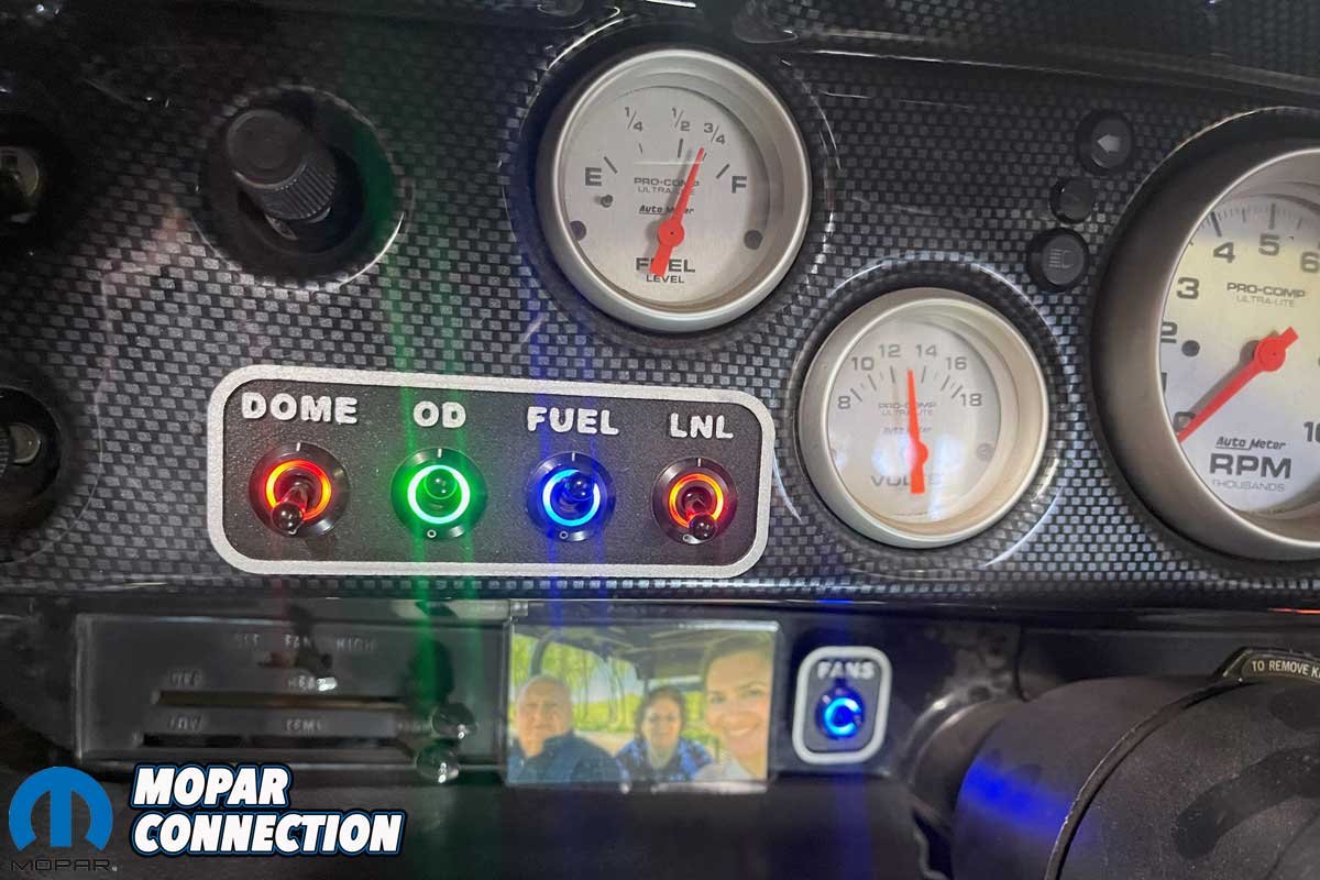We wanted a bank of toggle switches to control the electric fans, Gear Vendors overdrive, fuel pump, dome light, and roll control. Toggle-switched LED halo lights illuminated around the switches when driving at night. The panel that housed the switches and halo lights was 3D printed.