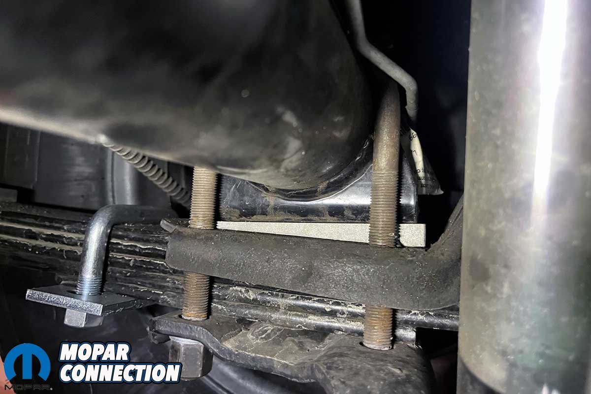 Above Left: The pinion angle was adjusted with shims between the leaf spring and perch on the axle housing. Above Center: We added a pair of new calipers to ensure the brake pedal was firm during our events. Above Right: After adding the torsion bars and Super Stock springs and adjusting the pinion angle, we aligned the ‘Cuda to take advantage of the new suspension and radial tires.