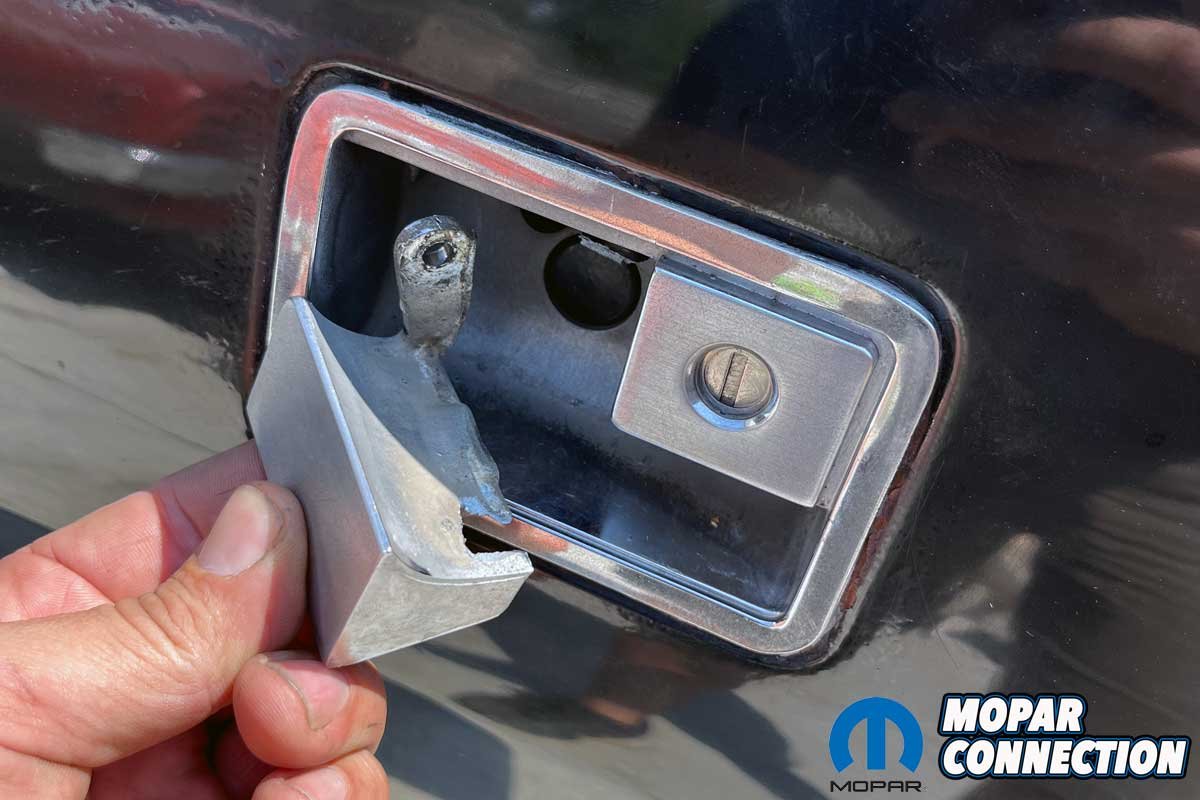 The trunk latch key rod mechanism broke during the Hot Rod Power Tour. We did an “on-the-fly” repair during the Power Tour. A new latch key rod was picked up from MegaPartsUSA. The parts fit perfectly. Fixing the driver’s side door handle was not planned, but the handle broke off one week before the event. AMD saved the day by rushing us a new handle.