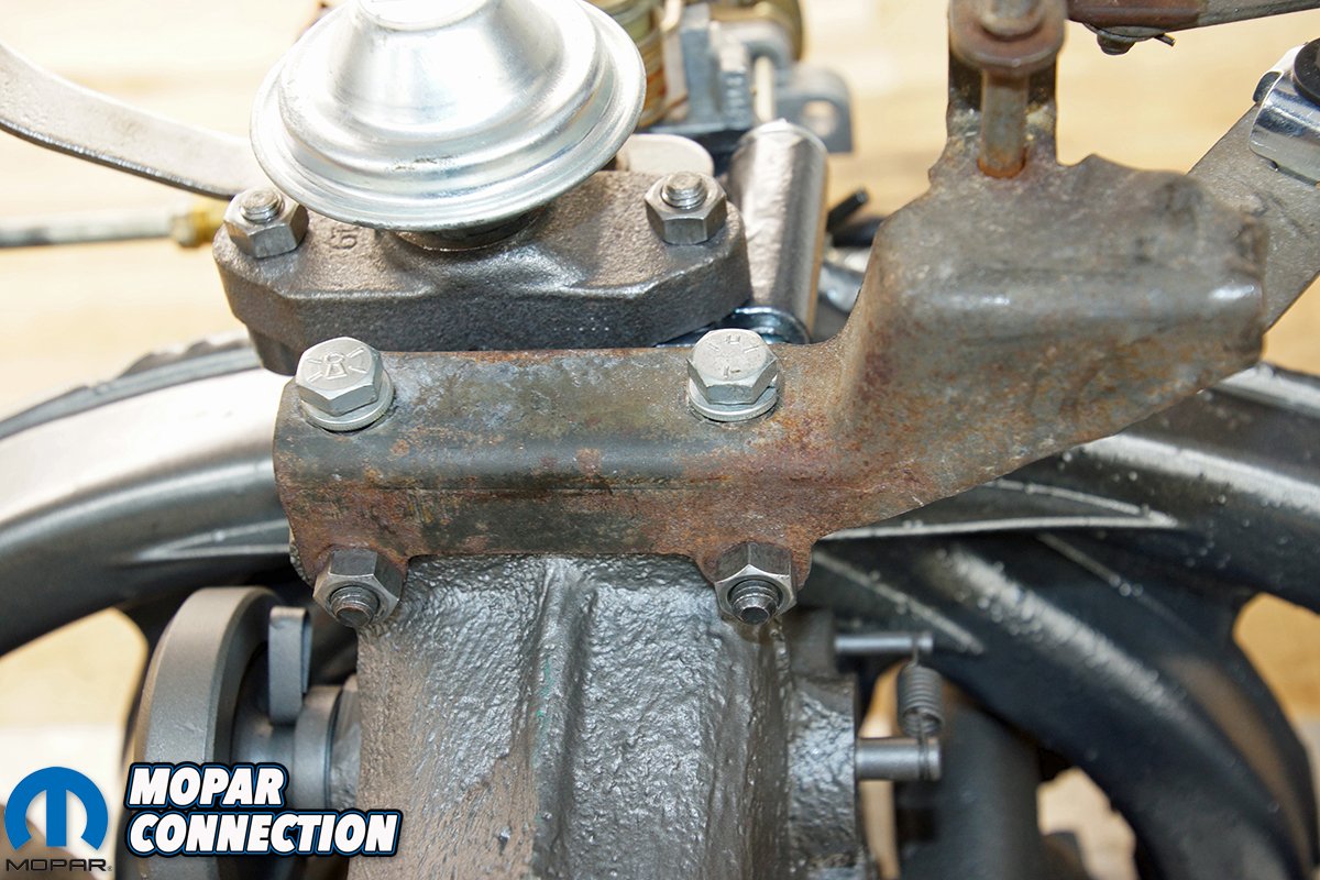 The biggest challenge for the carburetor swap was finding all the factory parts. After an extensive search, we were able to score a complete (minus the Carter carburetor) Super Six setup on Slantsix.org. The factory parts included, an aluminum intake, a later model exhaust manifold with an O2 sensor bung, the kick-down linkages, clips, springs, and the air cleaner housing. The parts all arrived as listed, and we were able to disassemble all the components, clean them, and reassemble everything using existing and new hardware.